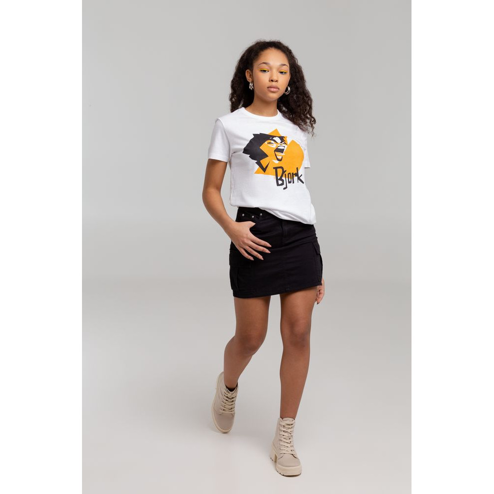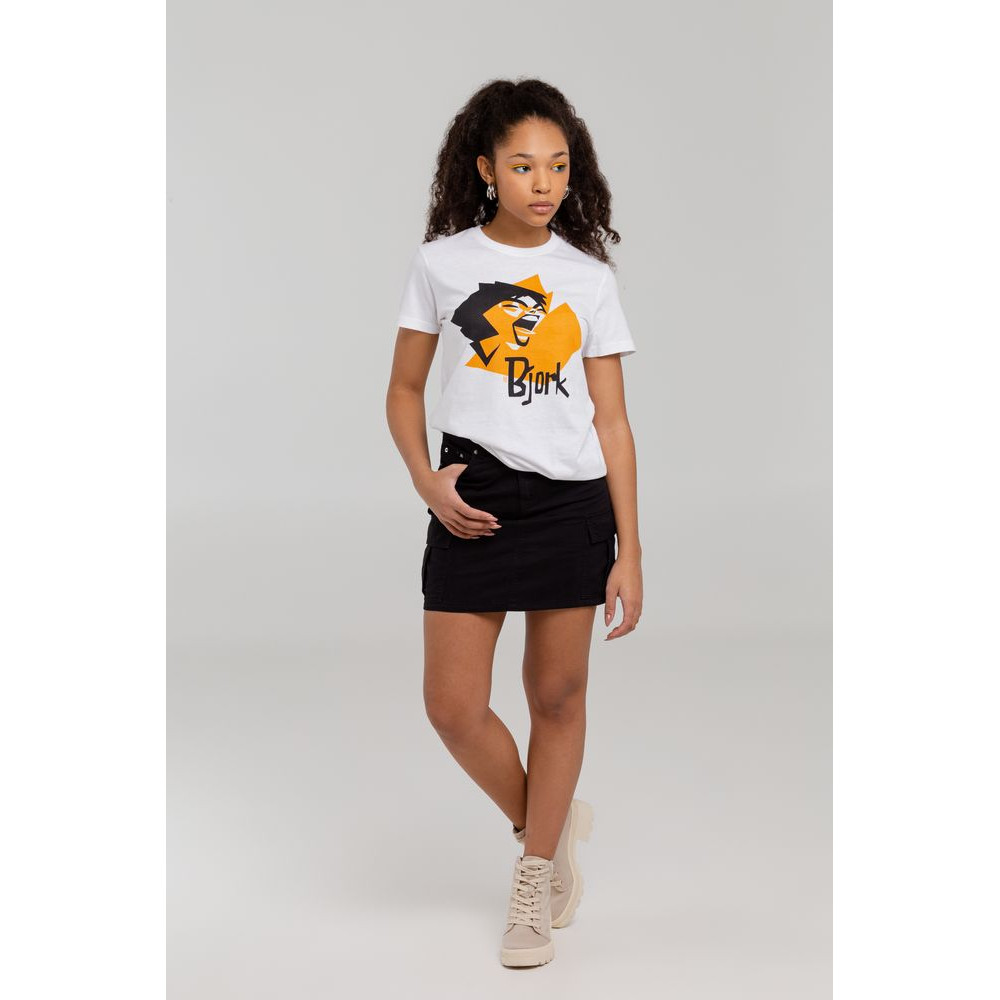 Женская футболка с уплотненными швами на плечах и двойным швом с эластаном. Четырехслойная резинка на воротнике предохраняет его от растяжения.