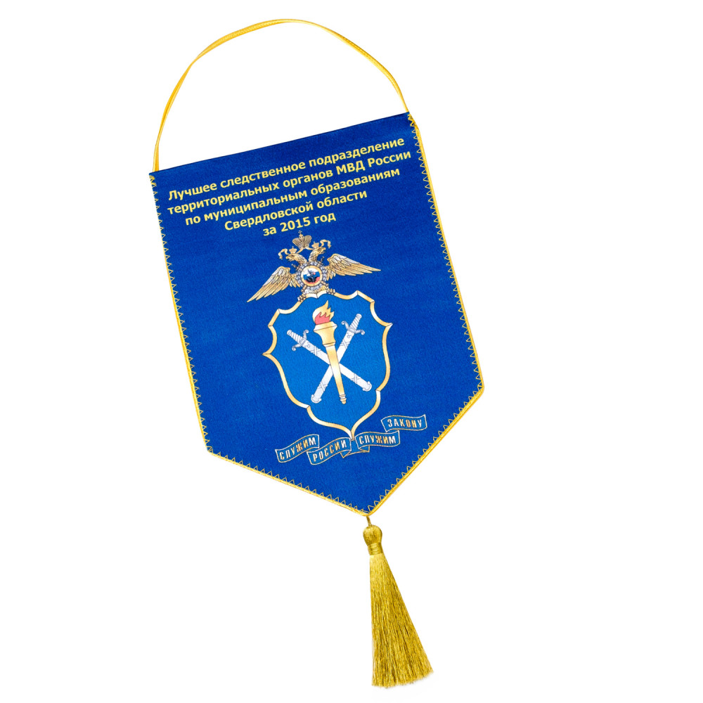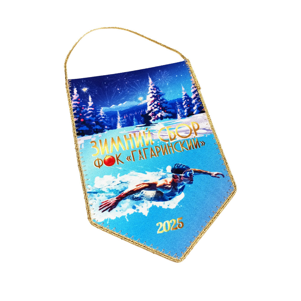 Печатный вымпел изготавливается из крепсатина, имеет основу из картона для придания жесткости, обшивается витым шнуром. Полноцветное изображение по макету заказчика наносится методом сублимации с одной стороны. При этом оборотная сторона остается белой.