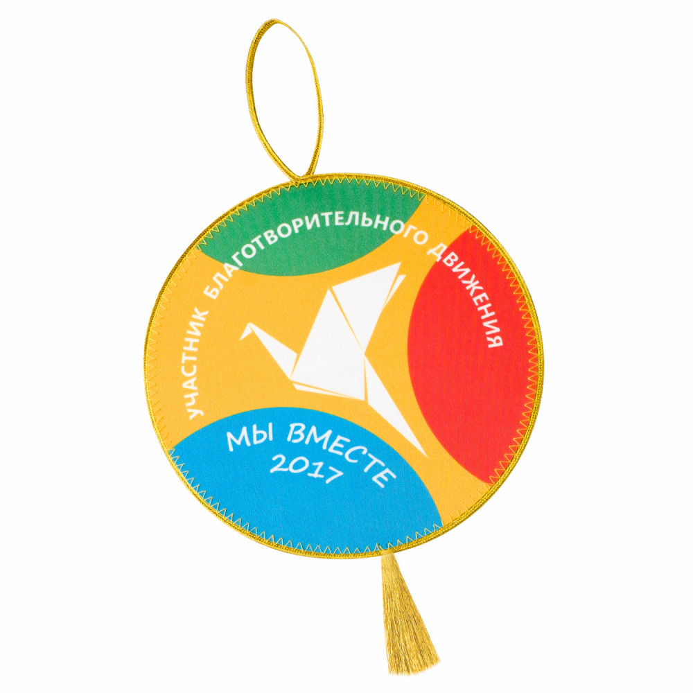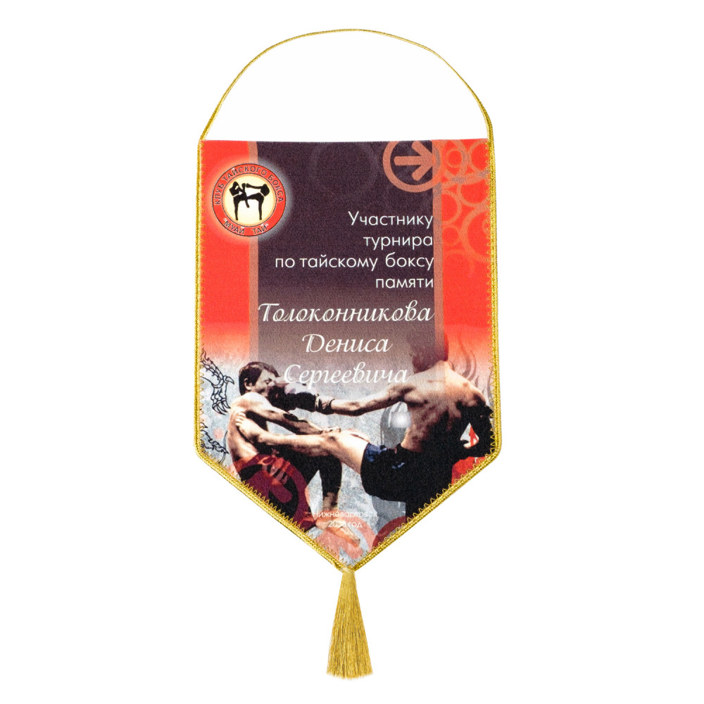 Печатный вымпел изготавливается из крепсатина, имеет основу из картона для придания жесткости, обшивается витым шнуром. По желанию заказчика дополнительно украшается кистью либо из самого шнура, либо дополнительным элементом. Полноцветное изображение по макету заказчика наносится методом сублимации с обеих сторон.