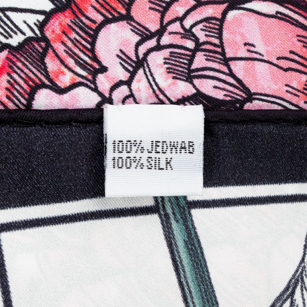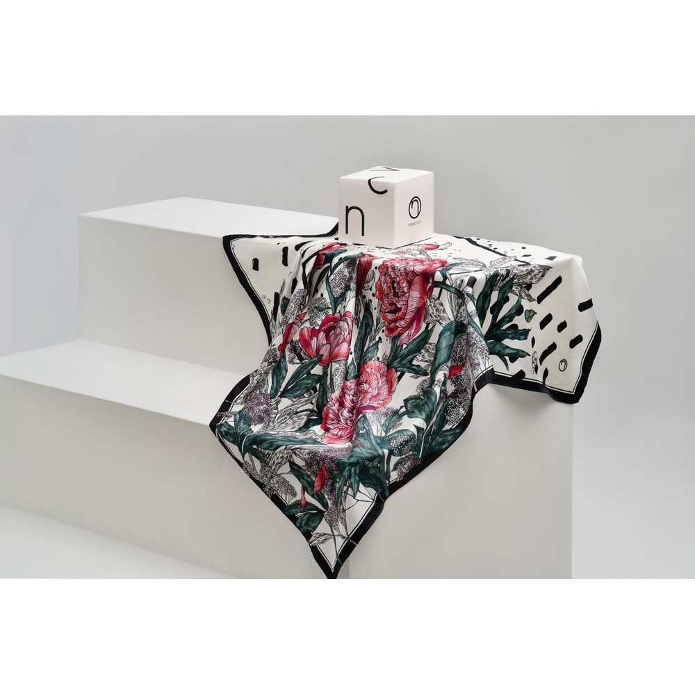 Шелковый платок с цветочным принтом открывает простор фантазии — его можно использовать как шарф, головной убор или декоративный элемент для верхней одежды и аксессуаров.