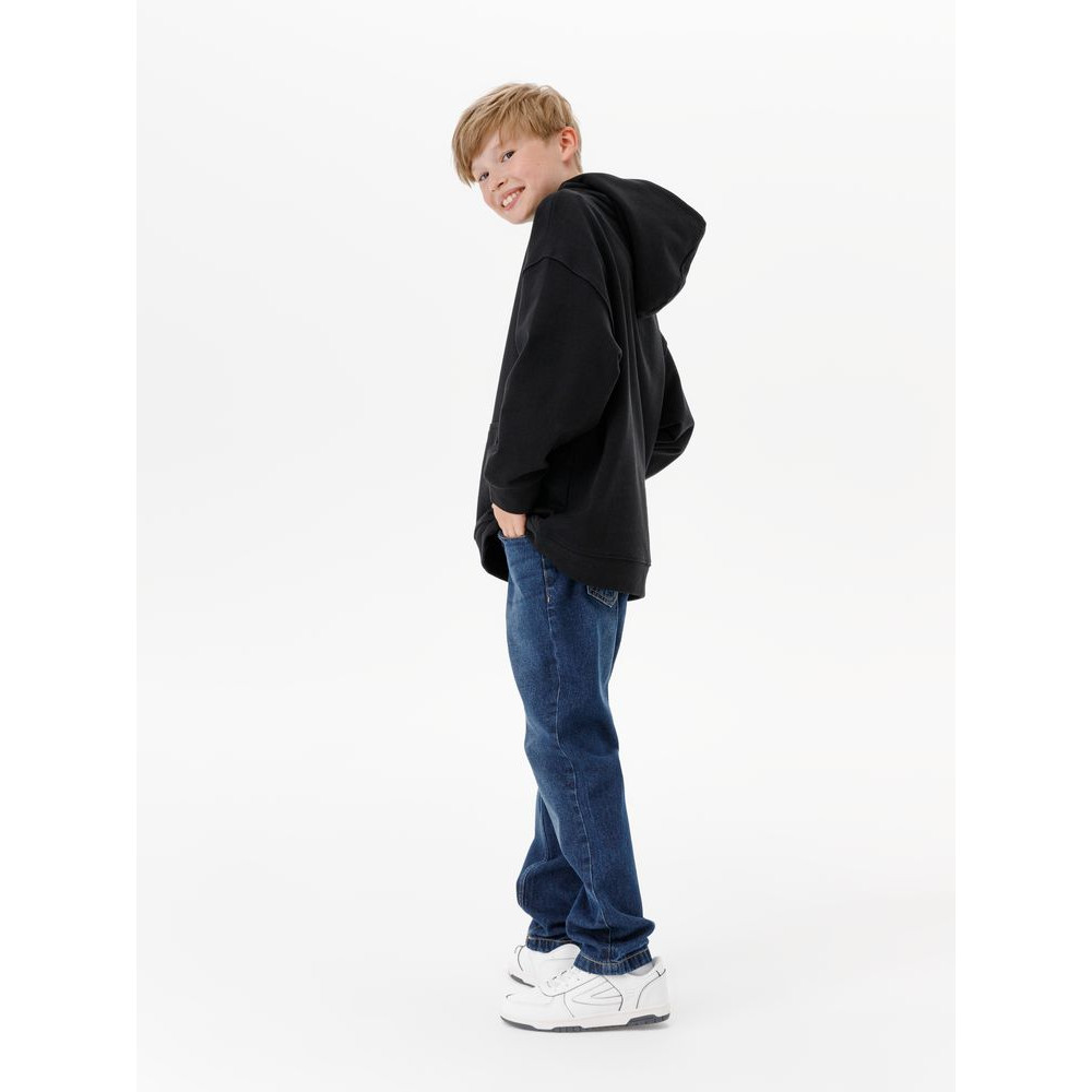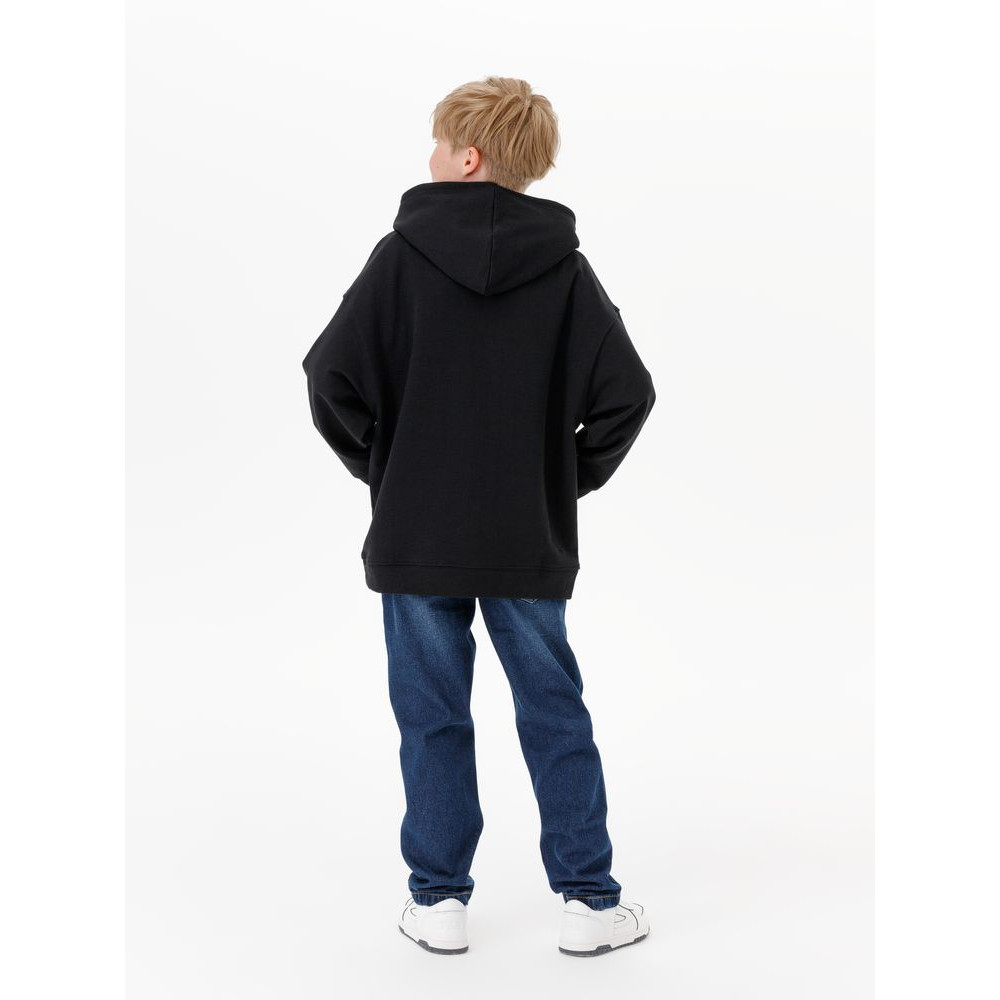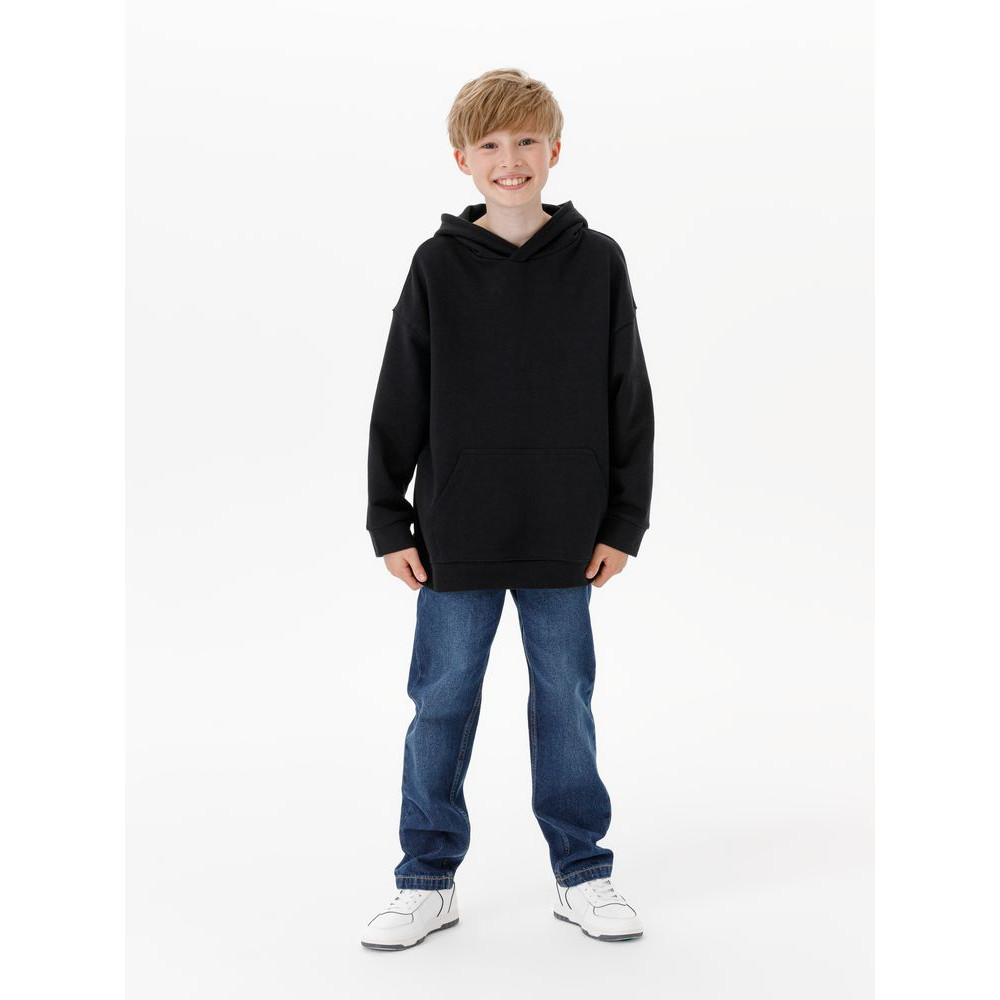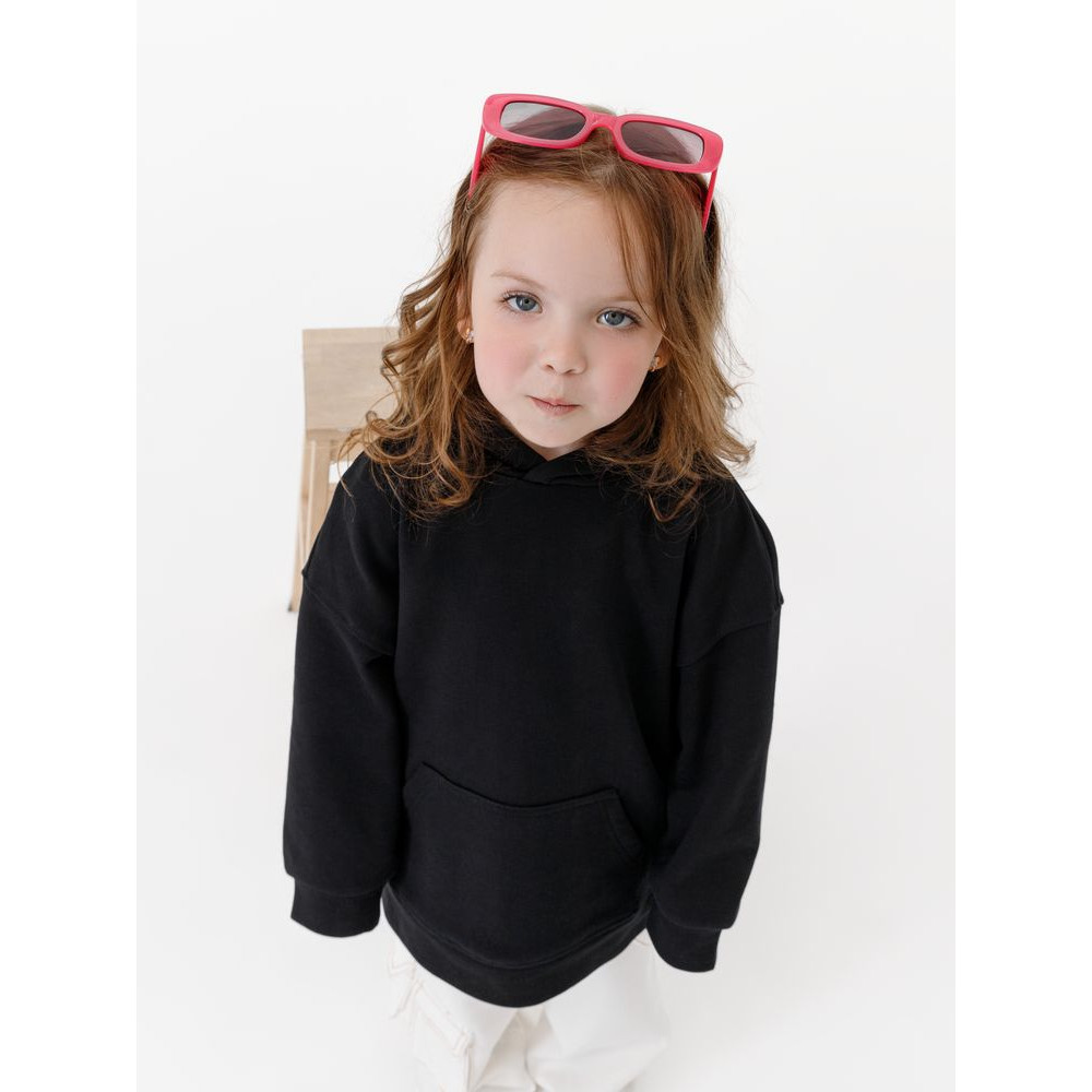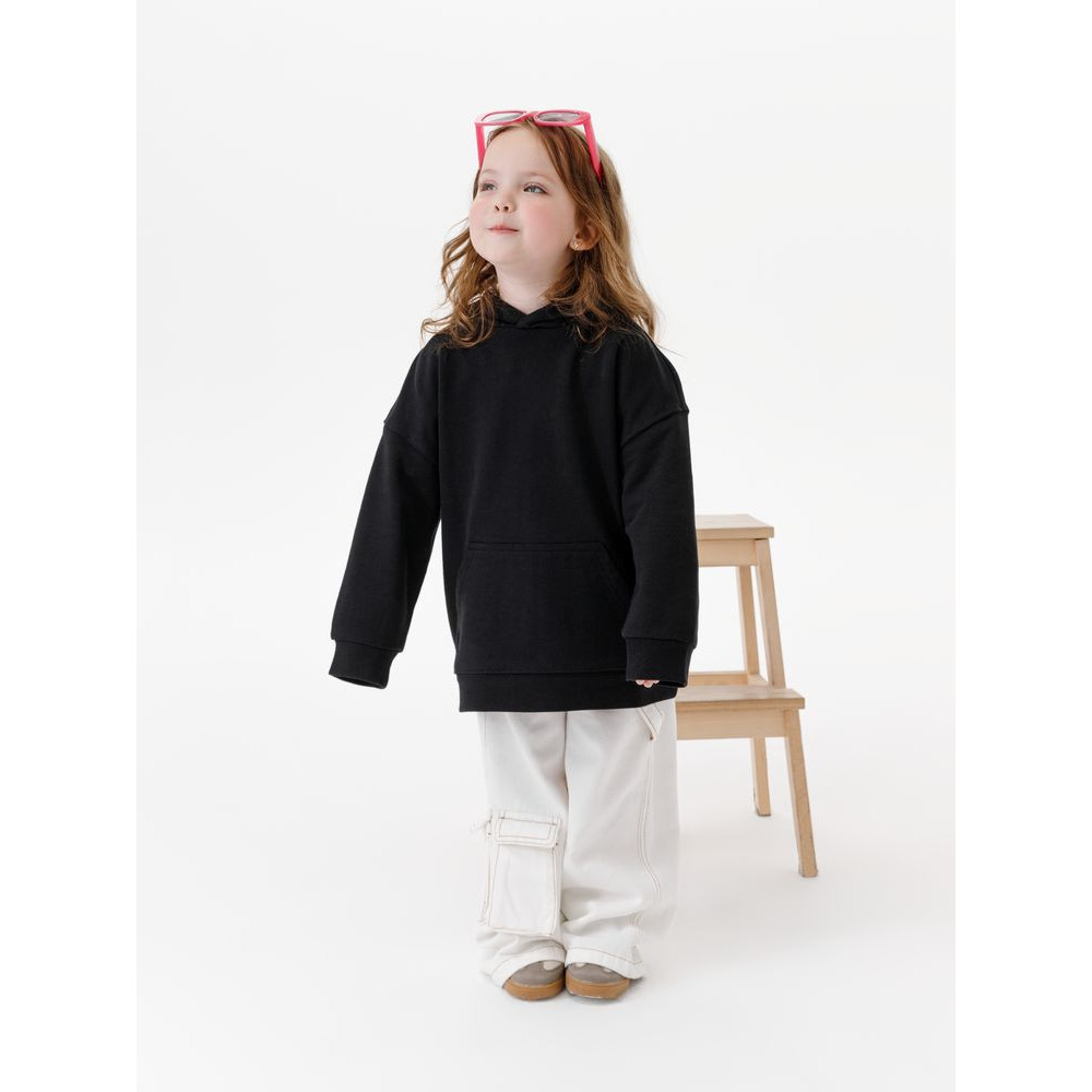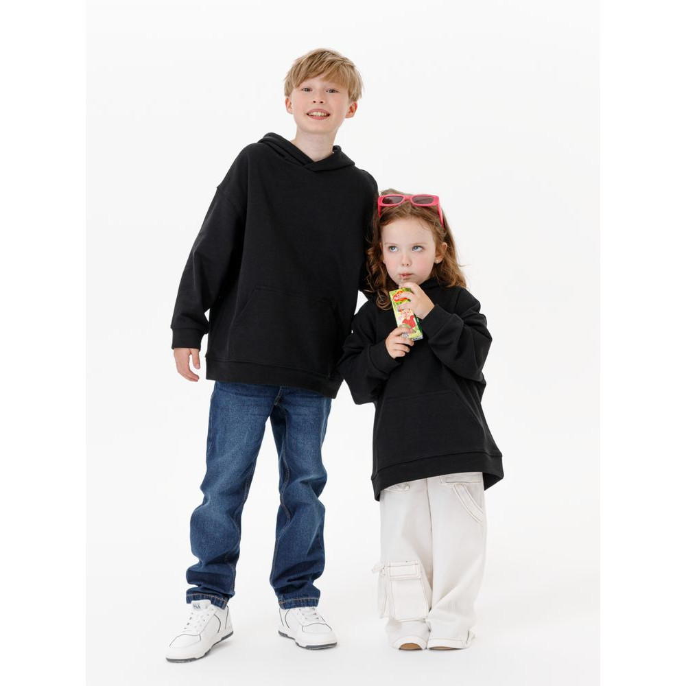 Детское худи оверсайз со спущенным плечом и карманом-кенгуру.