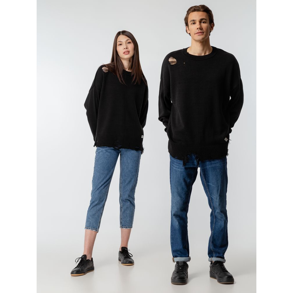 Оверсайз джемпер с круглым вырезом и рваными краями. Ворот, манжеты и низ изделия выполнены резинкой.