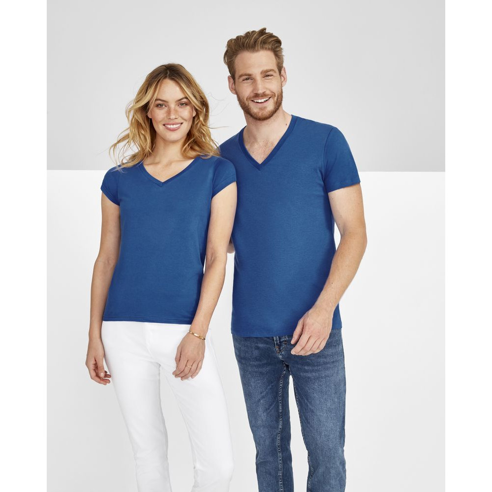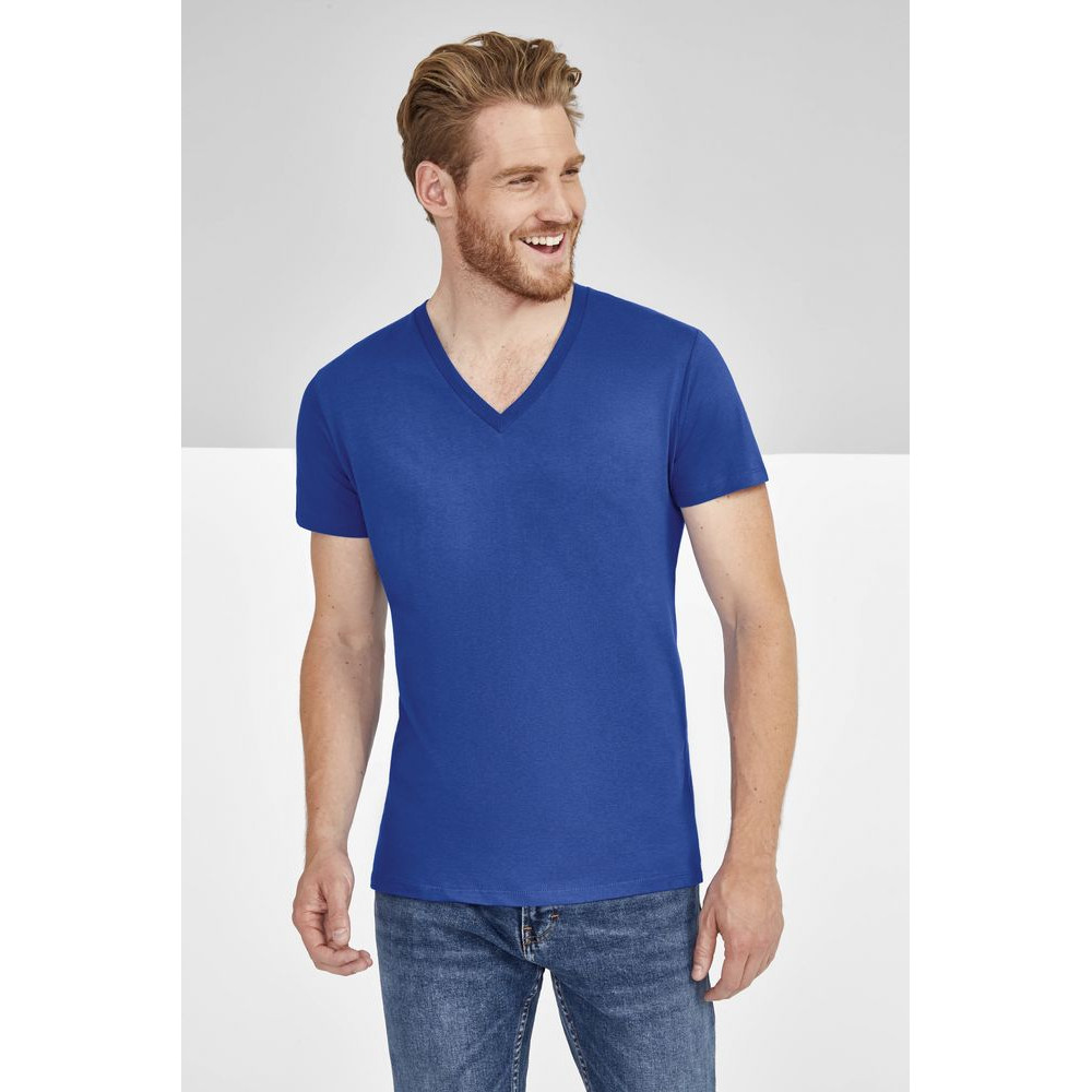 Модная мужская футболка с глубоким V-образным вырезом, отделанным резинкой 1*1, подойдет как для промо-акций, так и в качестве корпоративной униформы. Полугребенной 100% хлопок, двойная прострочка на рукавах и по низу изделия, укрепляющая тесьма по вороту.