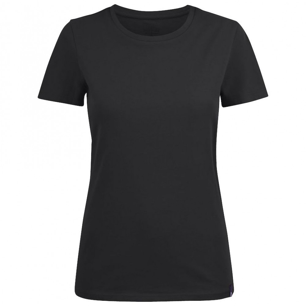 Женская футболка с круглым вырезом. Двухслойная резинка предохраняет воротник от деформации после стирки.