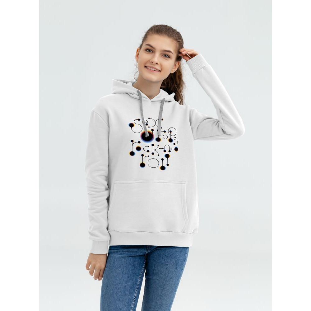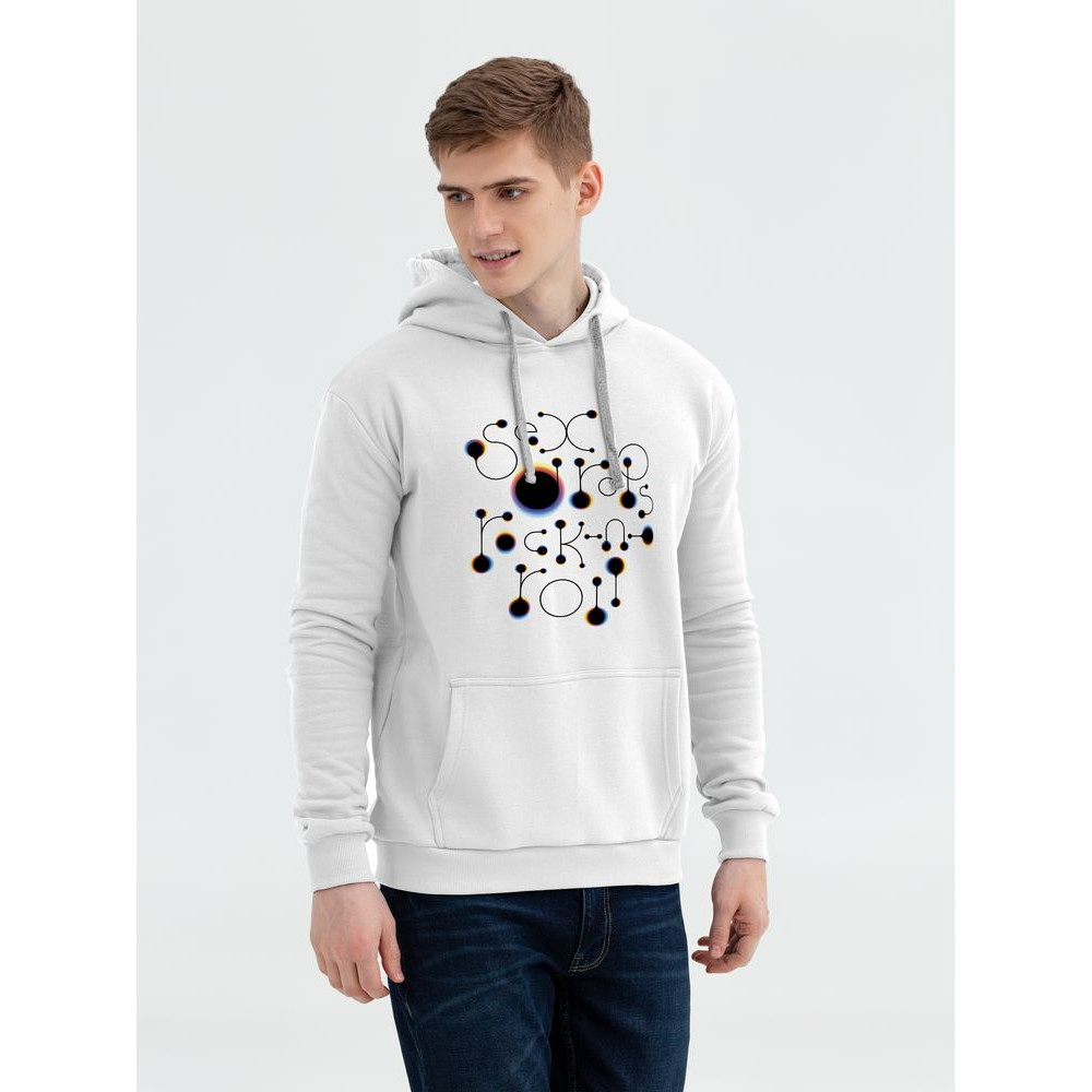 «Принтэссенция» поддерживает здоровый образ жизни: рок-н-роллить вполне можно и без запрещенных веществ! А кайф и радость жизни пусть передаются воздушно-капельным путем.Теплая толстовка с капюшоном и карманом-кенгуру.
