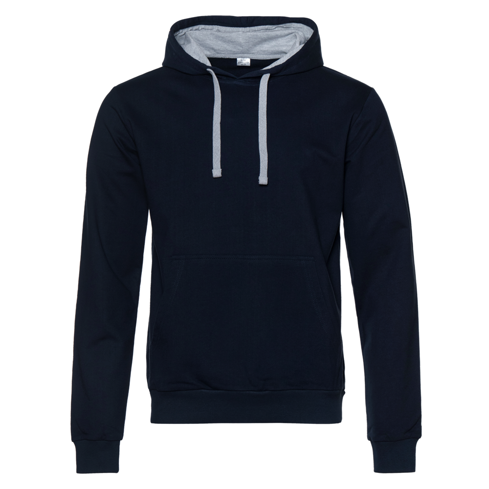 Толстовка прямого силуэта с капюшоном, втачным рукавом и карманом-кенгуру. Капюшон дополнен шнурком для регулирования прилегания, манжет и низ изделия оформлены широкой эластичной резинкой. Возможно два варианта исполнения: контрастные шнурок и бейка/шнурок и бейка в цвет толстовки.