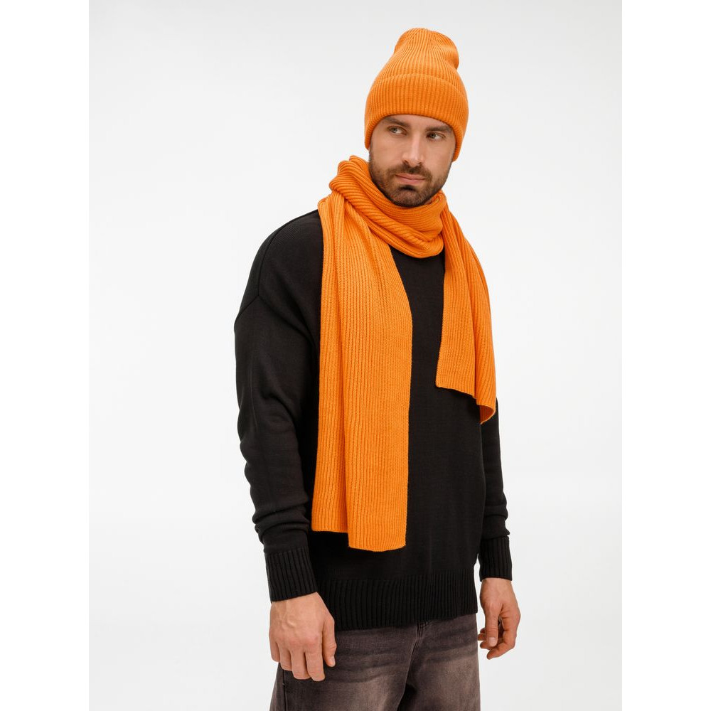 Удлиненная шапка с широким отворотом и фактурной вязкой мягко облегает голову, создавая элегантный силуэт. Широкий шарф с выразительным рельефом позволяет экспериментировать с драпировками, добавляя образу объем и динамику. Перчатки с аккуратной резинкой на манжете обеспечивают идеальную посадку и тактильный комфорт.