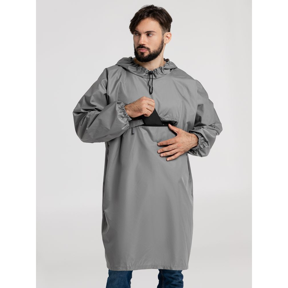 Дождевик-анорак с капюшоном и карманом на молнии спереди. Выполнен из ткани дюспо с матовой поверхностью — легкой, мягкой на ощупь, но устойчивой к повреждениям. Она не шелестит и практически не мнется. Благодаря пропитке дюспо обладает отличными водоотталкивающими и ветрозащитными свойствами.
