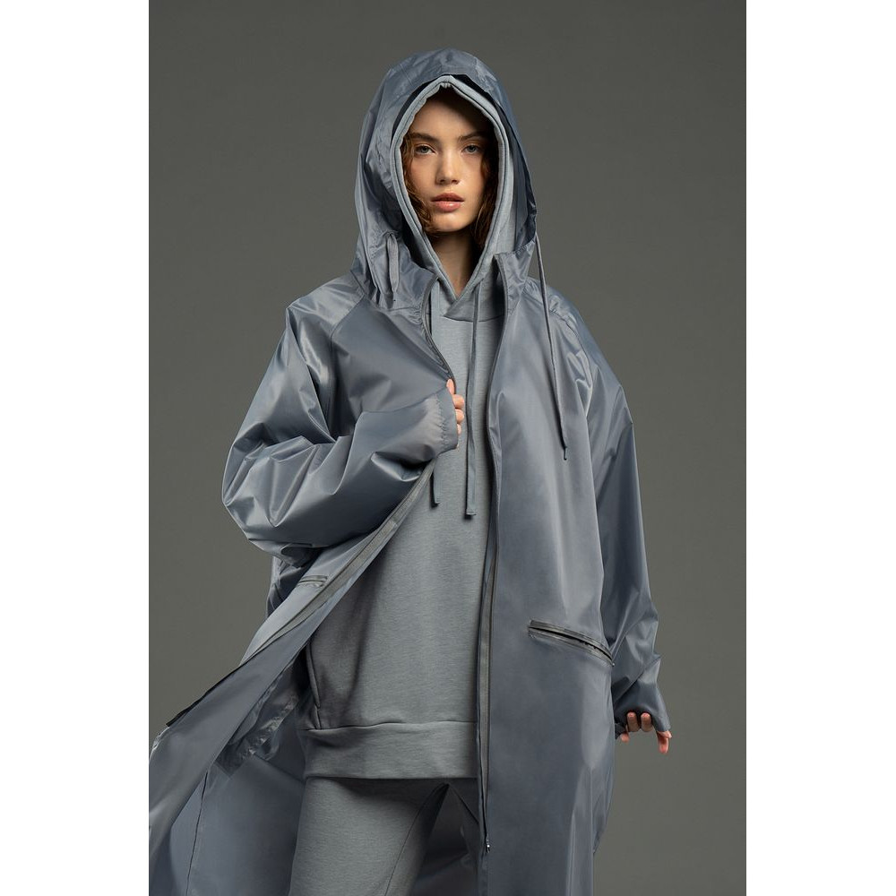 Плащ-дождевик на молнии с капюшоном из ткани таффета с полиуретановой пропиткой для защиты от сильного дождя.