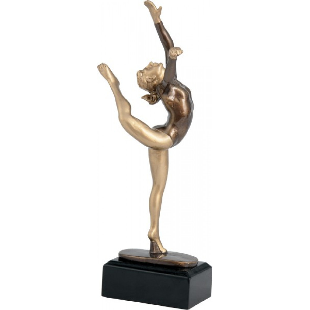 Фигурка литая "Гимнастика". Цвет бронза. Высота 16,5 см. Изображена гимнастка, выполняющая взмах ногой назад под углом 180 градусов. Фигурка установлена на цоколе черного цвета в форме прямоугольника.