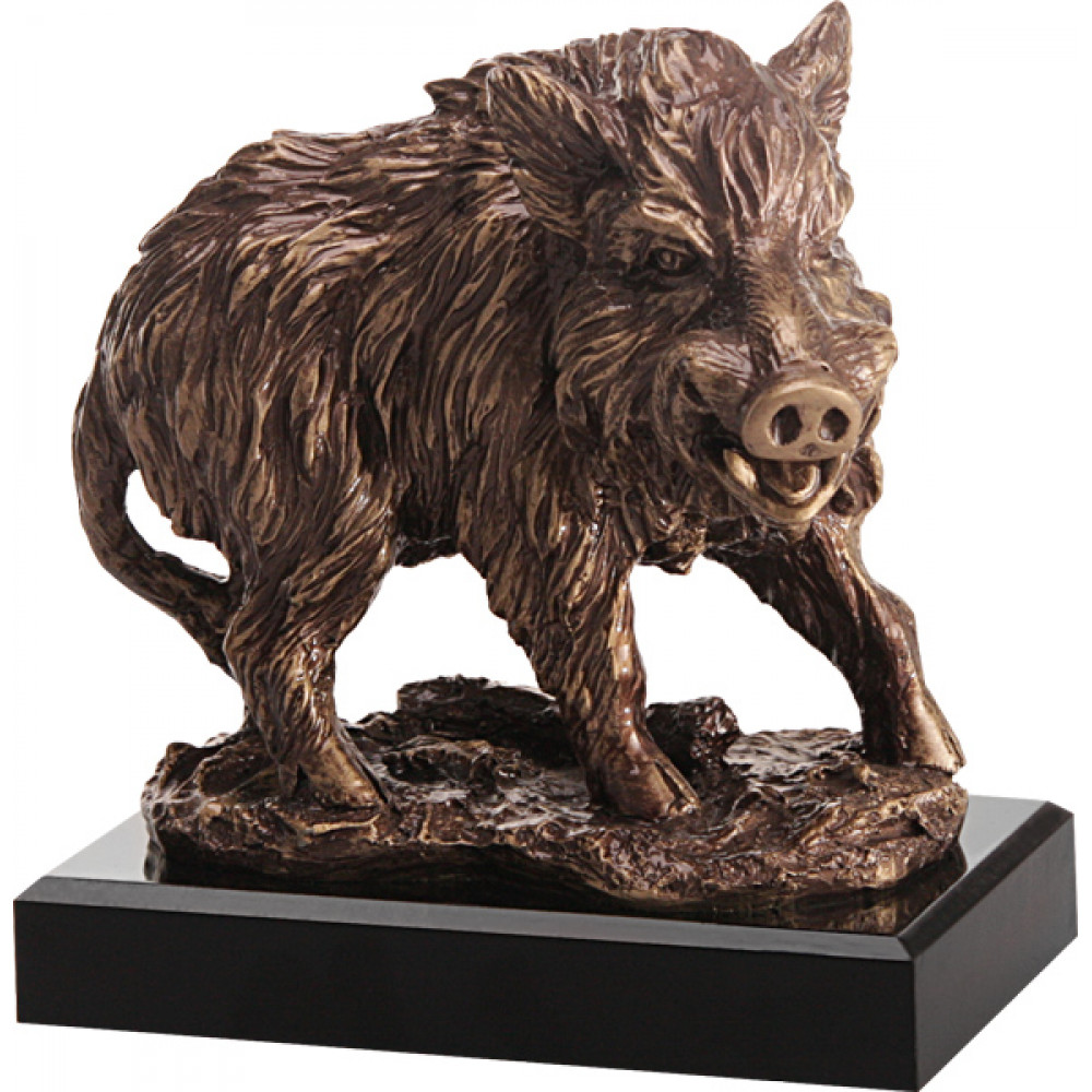 Фигурка литая "Охота". Высота 20 см. Цвет темно-бронзовый. Изображен кабан. Фигура установлена на черной подставке в форме прямоугольника.
