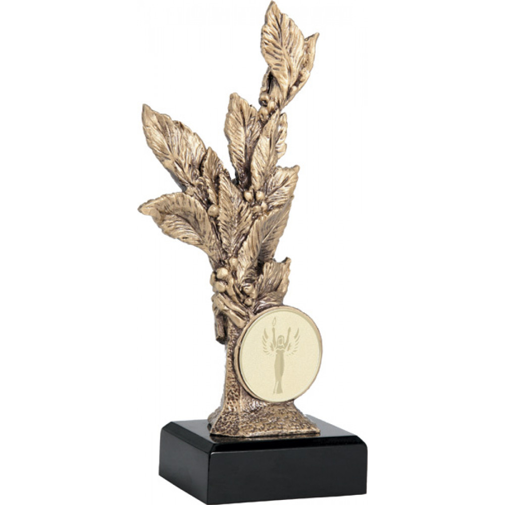 Фигурка литая "Трофей". Цвет бронза. Материал: пластик. Высота 25,5 см. Изображен лавровые куст, в нижней части которого расположено место под вкладку круглой формы, диаметр 50 мм. Фигурка установлена на цоколе в форме квадрата, цвет черный.