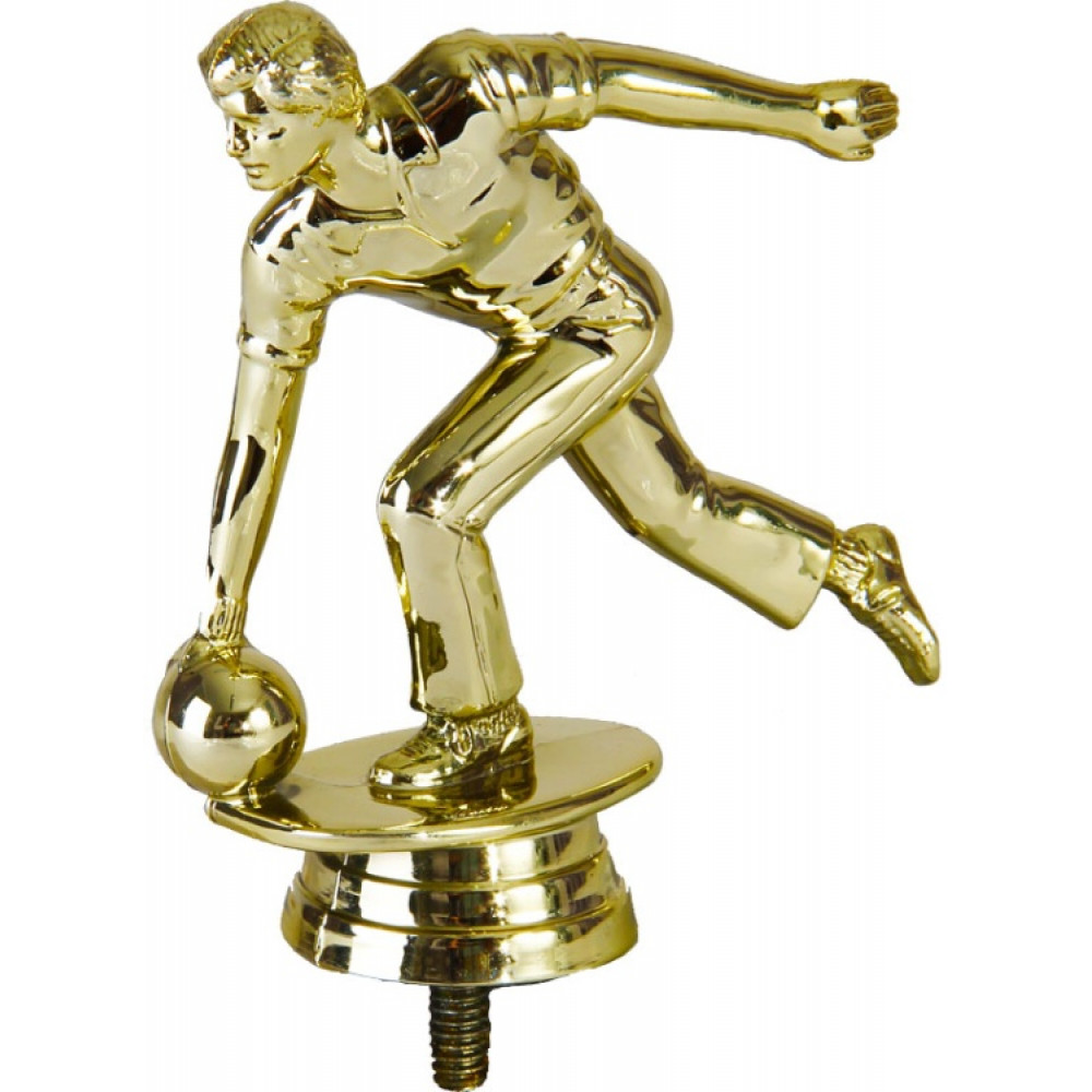 Цвет: золото, материал: пластик. Вид спорта: боулинг. Фигурка выполнена в виде мужчины. Его левая нога согнута в колене, правая зависла в воздухе. Игрок нагнулся вниз, зажав мяч в правой руке, левая отставлена назад. Игрок сконцентрировано смотрит на свою цель, не отводя взгляда. Мужчина находится на тонкой закруглённой по краям пластине – имитацией пола. Ниже - круглое основание, на котором имеются горизонтальные линии. Высота, см: 10.2 Вес, кг: 0.041. Фигурку возможно закрепить на цоколь, постамент или кубок.