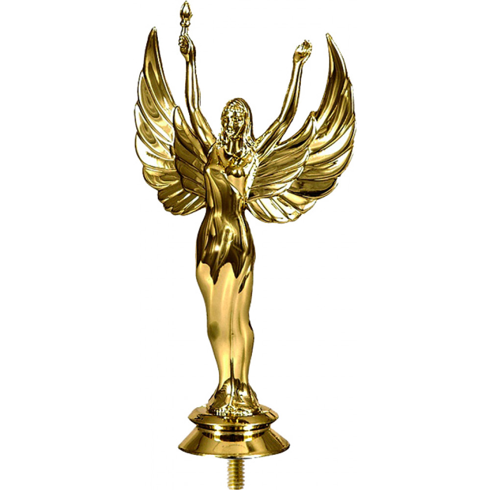 Фигурка пластиковая "Ника". Цвет золото, высота 26 см. Фигурка представляет из себя женщину с поднятыми вверх руками. Женщина имеет четкие очертания талии и груди. Руки немного согнуты в локтях, будто расслаблены. В правой руке женщина держит факел. Волосы до плеч, распущены. Одета в длинное платье с коротким рукавом, платье свободно струится по телу, из под платья видны кончики пальцев на ногах. За спиной у женщины расположены крылья. Высота крыльев схожа с высотой поднятых вверх рук. Концы крыльев заостренные. Женщина имеет славянские черты лица. Фигура установлена на небольшой подставке круглой формы. Фигурку возможно закрепить на цоколь, постамент или кубок.