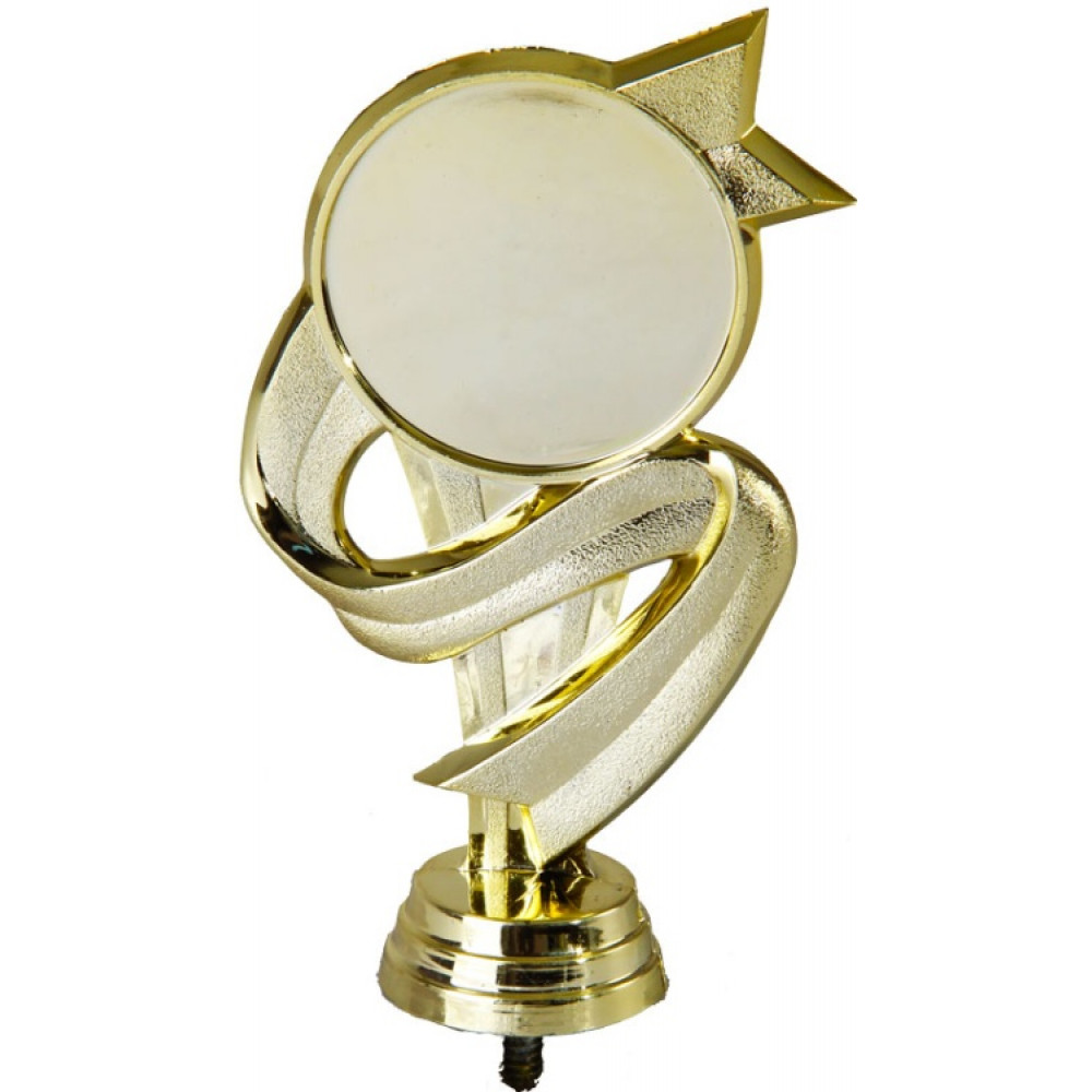 Цвет: золото, материал: пластик. Вид спорта: трофей. Фигурка выполнена в виде постамента, покрытого объёмными вертикальными линиями, что визуально удлиняет его. Вверху постамент украшает круглое место для нанесения персонализации, обрамленное тонким золотым обручем. Постамент пересекает загнутая лента с треугольными концами. Фигурка выполнена в золотом цвете, что придаёт ей роскоши и уникальности. Ниже - круглое основание, на котором имеются горизонтальные линии. Высота, см: 13.3 Вес, кг: 0.04. Фигурку возможно закрепить на цоколь, постамент или кубок.