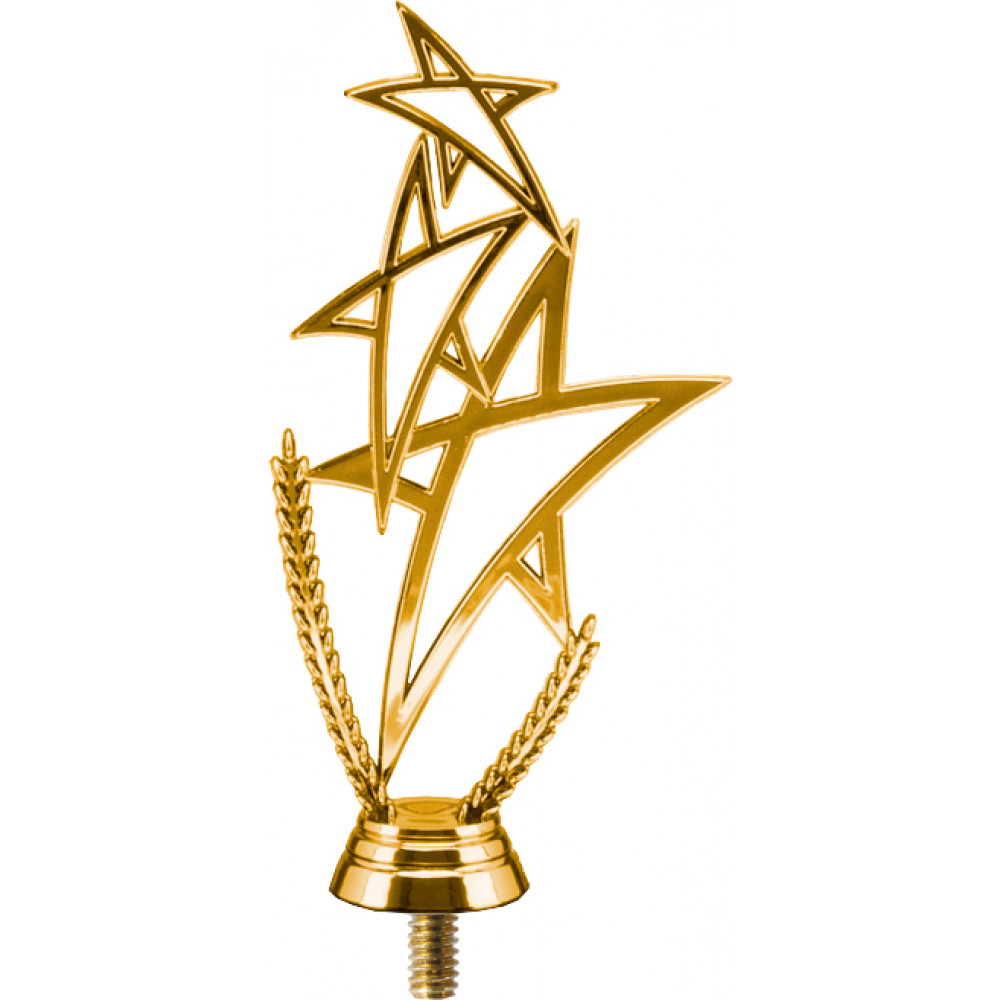 Фигурка пластиковая "Звезды". Высота 16 см. Фигурка золотого цвета, представляет из себя три звезды, расположенные друг над другом. Снизу расположена самая большая звезда, сверху-самая маленькая. Звезды состоят из линий и имеют внутри пустое пространство. Два острых нижний угла нижней звезды упираются в золотые колоски. Нижний более короткий угол упирается в более короткий колосок, более длинный нижний угол (с левой стороны) упирается в более высокий колосок. Данная фигура установлена на подставке круглой формы, имеющей две вдавленные линии. Фигурку возможно закрепить на цоколь, постамент или кубок.