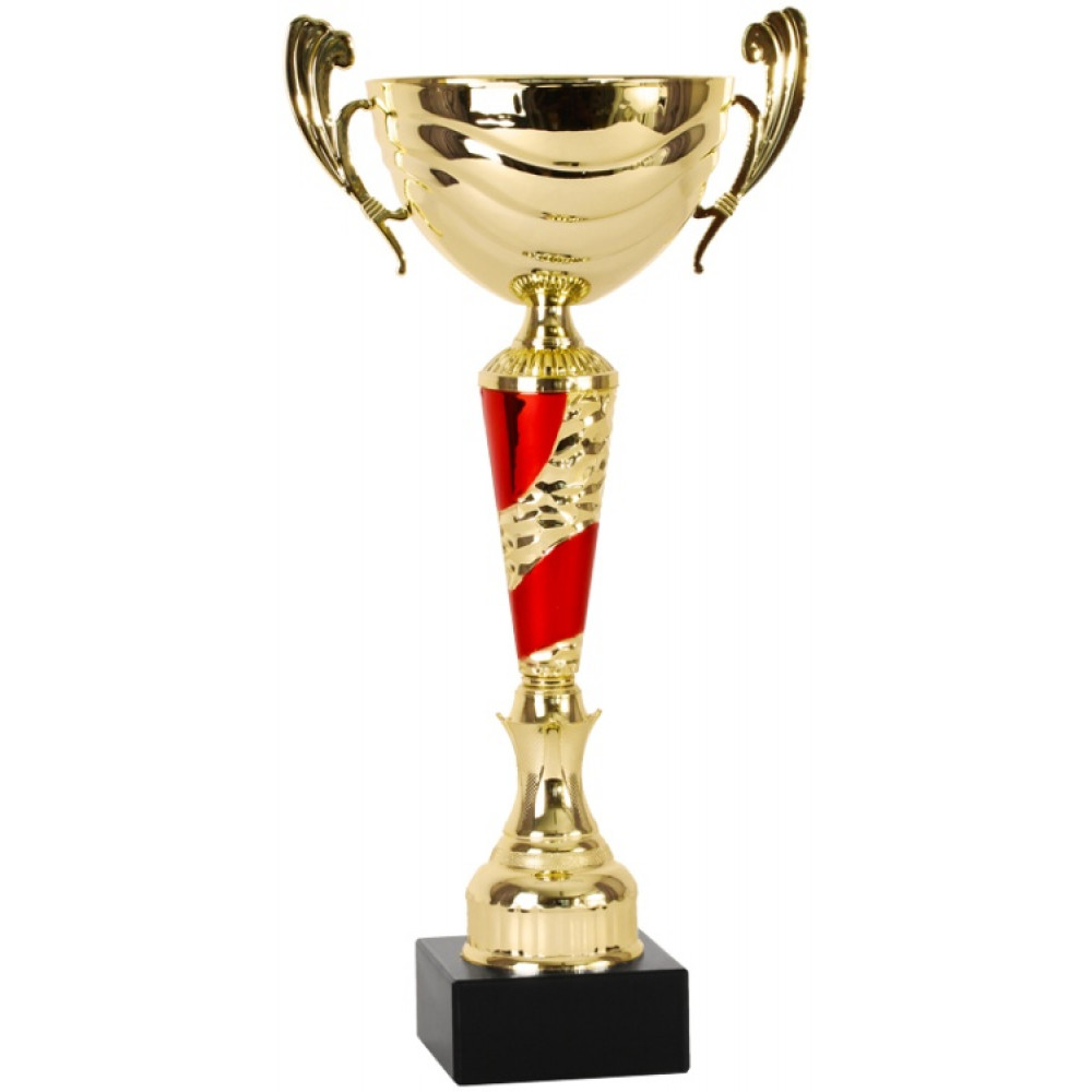 Кубок состоит из трех частей: чаша, стем, цоколь.¶Чаша имеет вытянутую цилиндрическую форму, ссужающуюся сверху и снизу, материал – стекло, толщиной 10мм. Цвет – белый матовый. Чаша украшена стеклянными бордовыми линиями, переплетающимися друг с другом по всей чаше.¶Стем кубка имеет форму выпуклого конуса. Материал - стекло, цвет - прозрачный.¶Цоколь кубка выполнен в форме куба, с отступом у основания. Материал – пластик. Цвет – темное дерево.