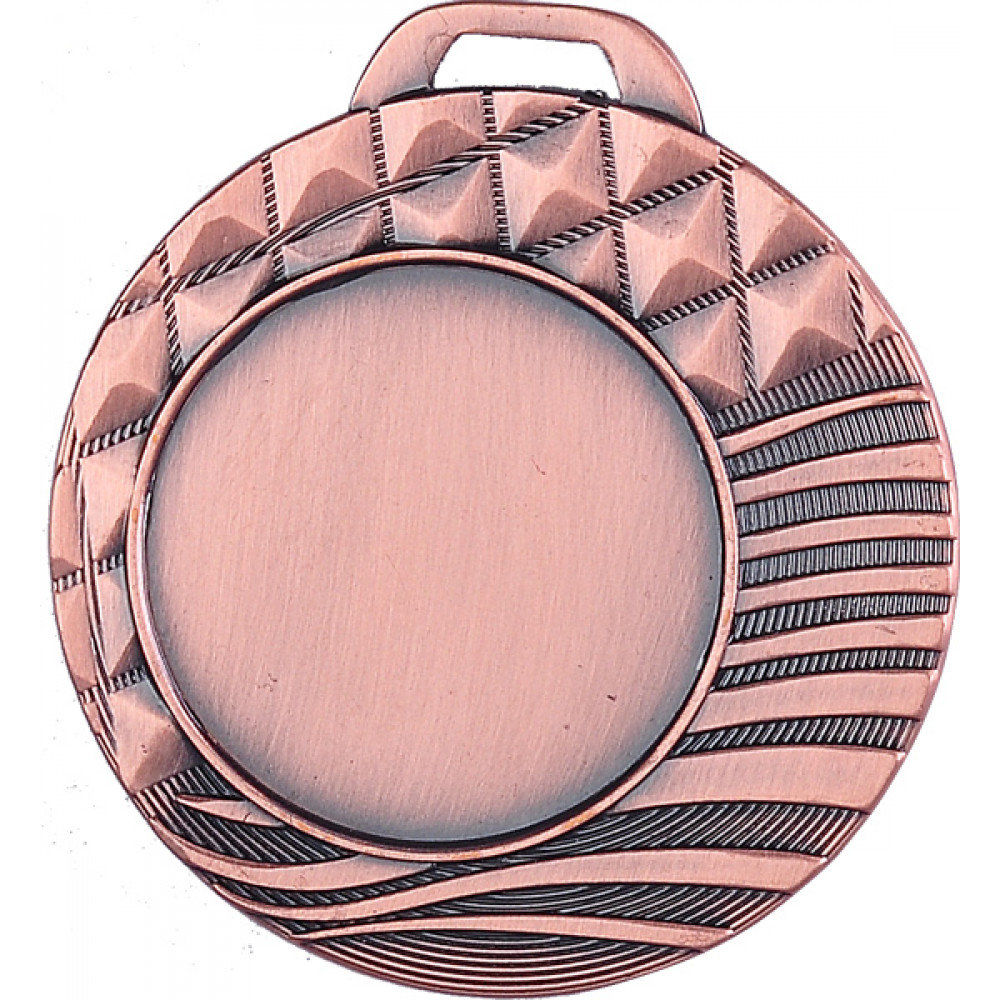 Медаль круглая металлическая. Диаметр 40 мм, толщина 2 мм.¶Цвет медали, имитирующий золото/серебро/бронзу.¶Сверху расположено прямоугольное ушко для крепления ленты. ¶В центральной части левой аверса расположено место под вкладку, диаметр 25 мм, имеет тонкий кант. ¶В правой нижней части медали прорисованы 9 волнистых линий шириной от 1 до 3 мм. В левой и верхней части медали изображен орнамент в виде рельефных ромбов. Задний план в виде тонких выпуклых линий, огибающих по диаметру место под вкладыш.¶На медали нет никаких других изображений, нет рисунков, относящихся к конкретному виду спорта.