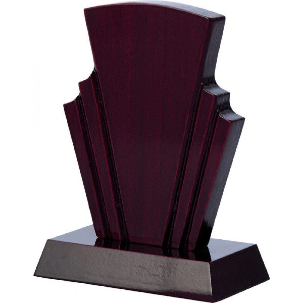 Награда деревянная. Цвет - коричневый. Фигура расположена вертикально, с левой и правой стороны фигуры расположены по три острый угла, образующихся от вогнутый во внутрь сторон. На лицевой стороне фигуры изображены вдавленые прямые линии, идущие от углов вниз. Фигура установлена на подставке в форме прямоугольника.