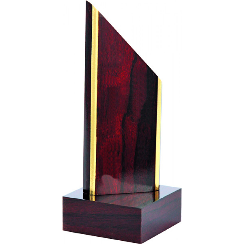 Награда деревянная. Цвет - коричневый. На квадратной подставке установлен элемент в виде прямоугольника со срезанной верхней частью под углом 45 градусов. Элемент установлен на цоколе по диагонали.