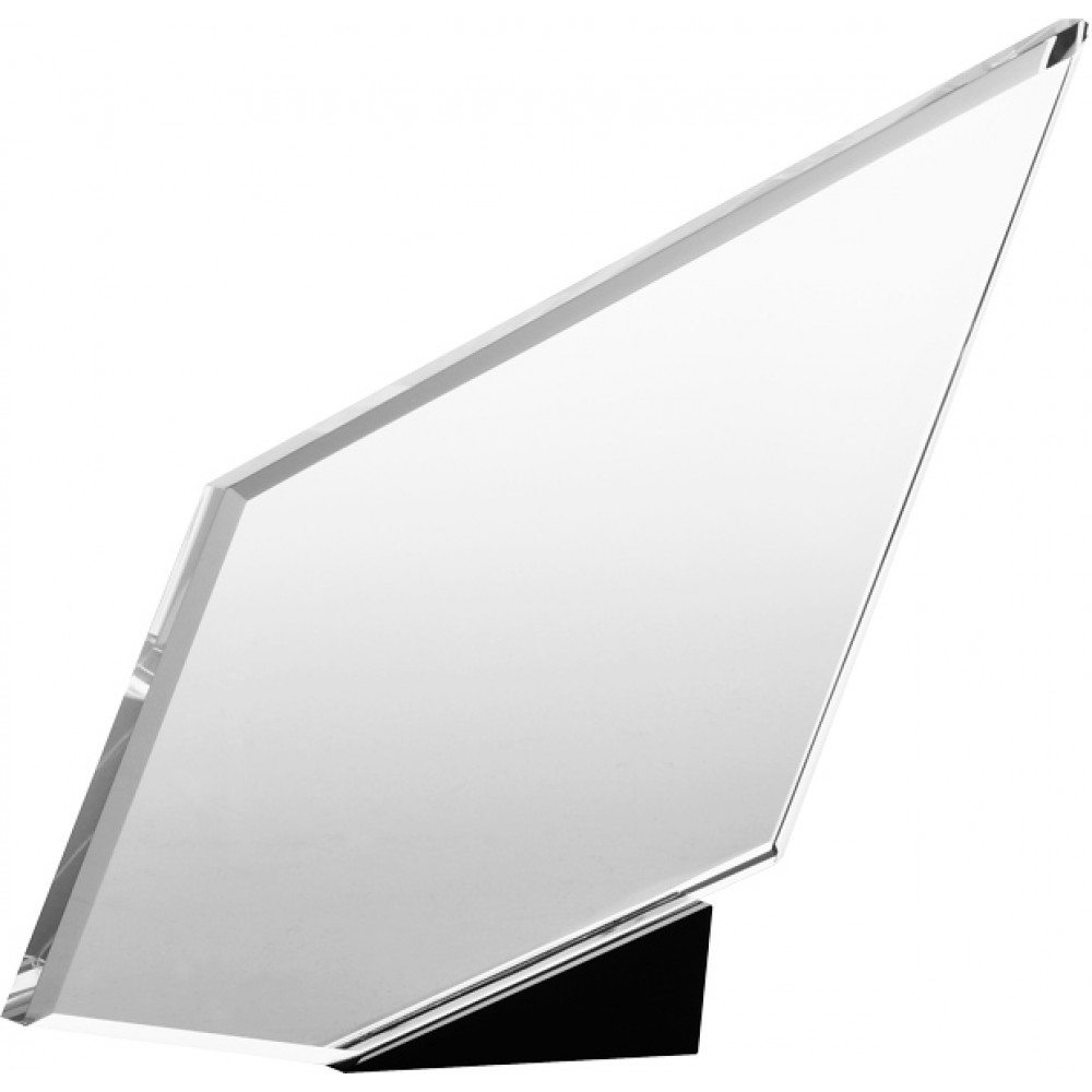 Награда хрустальная. Прозрачная. Высота фигуры 22 см. В комплекте футляр из бумвинила. Фигура в форме пятиугольника, расположена горизонтально. Фигура установлена на треугольную подставку черного цвета.