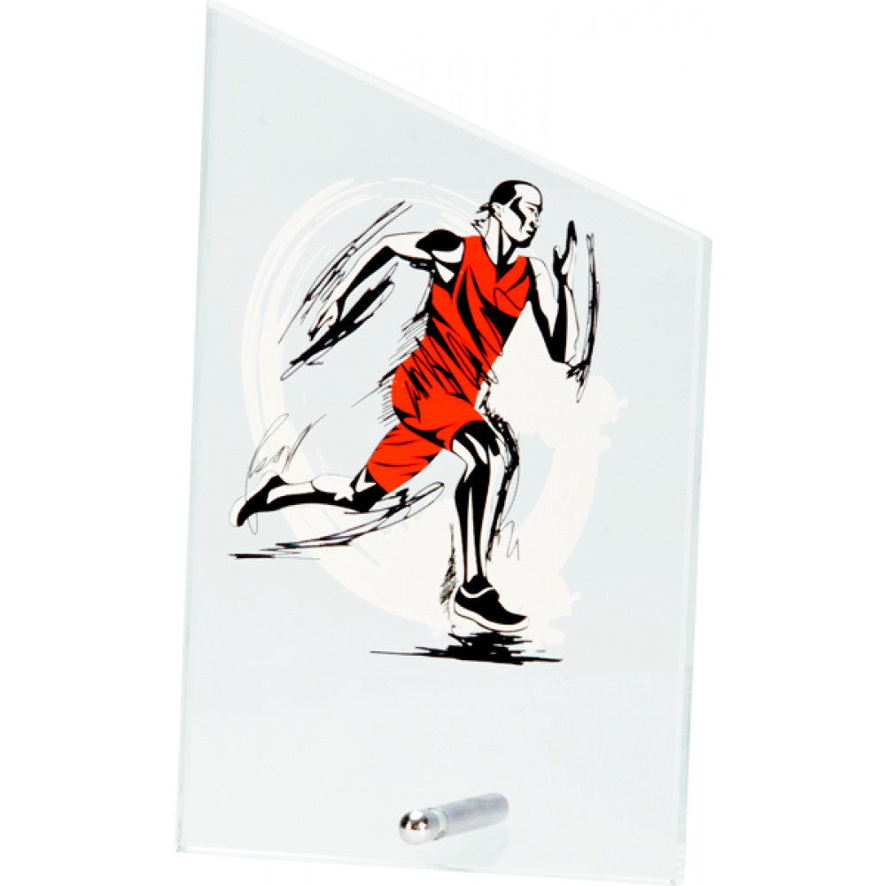 Награда стеклянная "Бег", цвет прозрачный. Представляет собой четырехугольник с неравными верхними углами. Левый угол острый, правый - тупой. В центре нанесено изображение спортсмена, бегущего короткую дистанцию. Цвет изображения черно-белый, форма спортсмена красного цвета. Размер награды 12,5*20,5 см.¶В нижней части фигуры возможно нанесение персонализации.