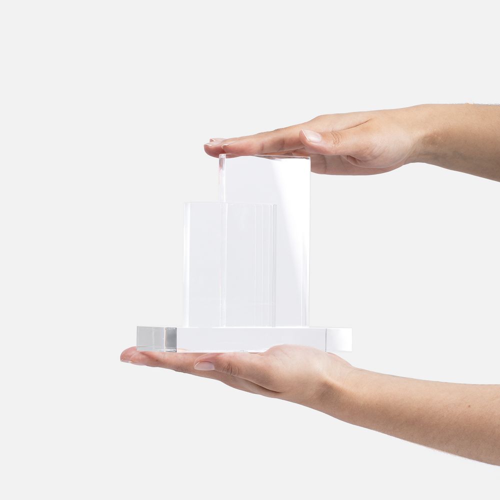Элегантные линии и прозрачный материал придают стеле Doublet эстетическую привлекательность, позволяя ей гармонично сочетаться с любым интерьером — от офисов до выставочных залов. Акрил (оргстекло) отличается прочностью и легкостью, что обеспечивает долговечность и устойчивость к повреждениям. Благодаря двухуровневой конструкции стела станет прекрасным холстом для идей и творчества и позволит создать уникальную награду со множеством элементов дизайна.