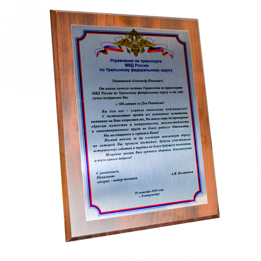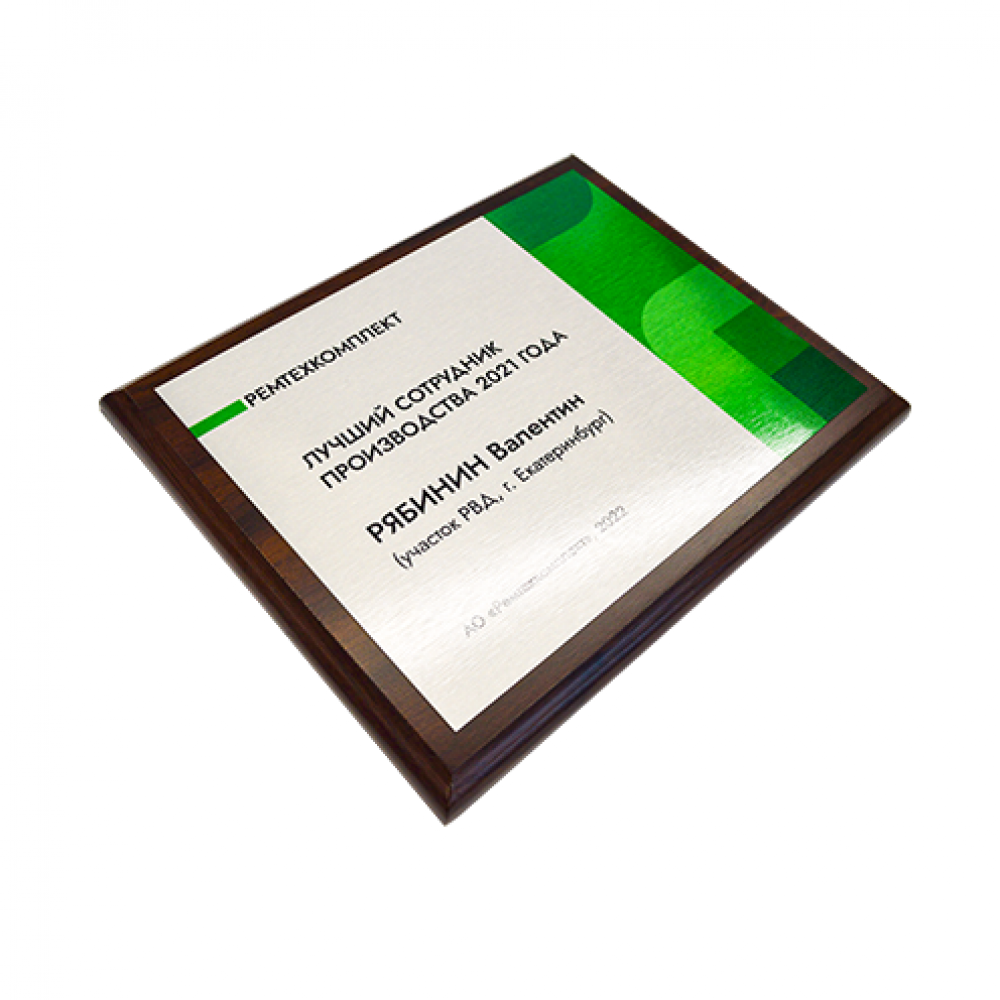 Основание плакетки выполнено из МДФ с покрытием под дерево или камень различных цветов. Металлическая пластина выполнена из алюминия, цвета золото или серебро по желанию заказчика. Изображение на пластину нанесено методом сублимации. Небольшой нюанс данной технологии: цвета нанесения могут незначительно искажаться за счёт цвета самой пластины. Пластина с нанесенным на неё изображением крепится к основанию с помощью специального двухстороннего скотча.