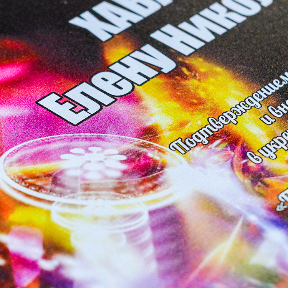 Основание плакетки выполнено из МДФ с покрытием под дерево или камень различных цветов. На него нанесено изображением методом УФ-печати. Данная технология позволяет получить детализированное изображение с точно переданными цветами и оттенками.