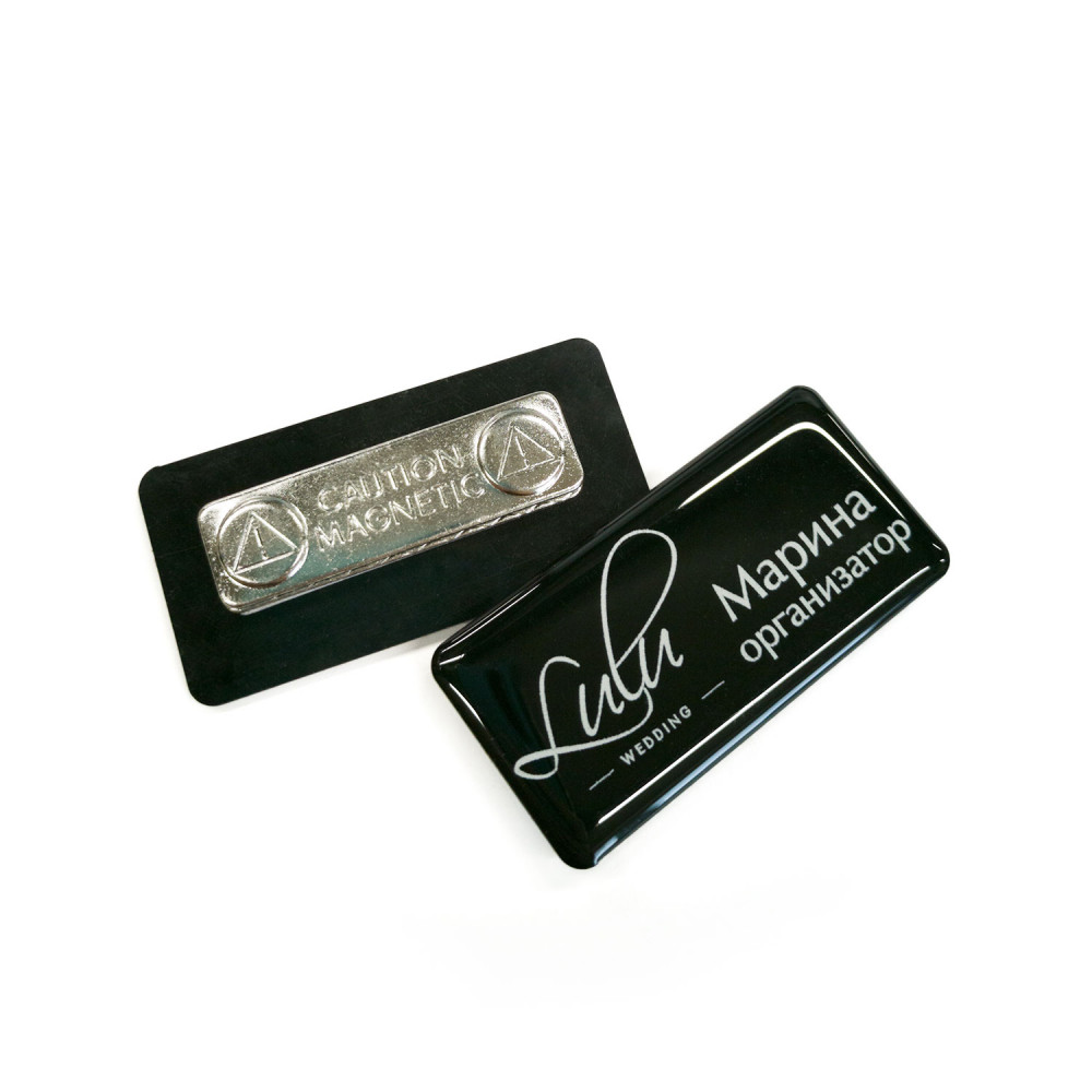 Материал - двухслойный пластик. Он состоит из двух слоев разного цвета - основы и верхнего слоя. Основа: черный, белый, либо прозрачный пластик толщиной 0,8 – 3,2 мм. Верхний слой: специальное покрытие различных цветов, фактур и степени глянца. Пластик - наиболее практичный для бейджа материал, стойкий к загрязнению, царапинам и воде.