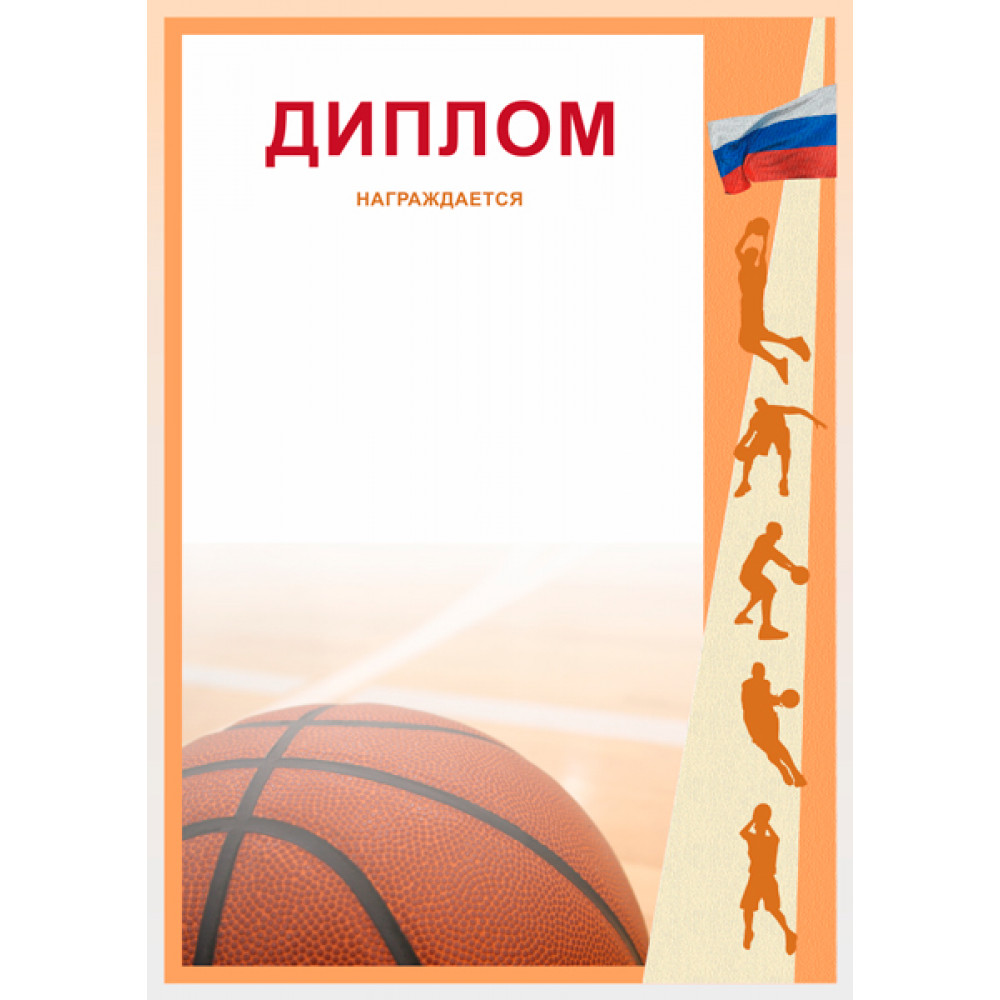 Диплом, формат А4. Бумага матовая, толщина 200 гр, полноцветная печать. ¶Фон диплома переходящий от белого в светло-оранжевый сверху вниз. В левом нижнем углу изображен баскетбольный мяч. В верхней части по центру написано слово "Диплом" красным цветом, под ним написано "награждается" оранжевым цветом. С правой стороны диплома расположена полоса бежевого цвета, расширяющаяся сверху вниз, и полоса оранжевого цвета, расширяющаяся снизу вверх. На бежевой полосе оранжевым цветом изображены силуэты баскетболистов в количестве 5 штук, в верхнем правом углу изображен российский флаг, извивающийся на ветру. Диплом имеет окантовку оранжевого и светло-оранжевого цветов.