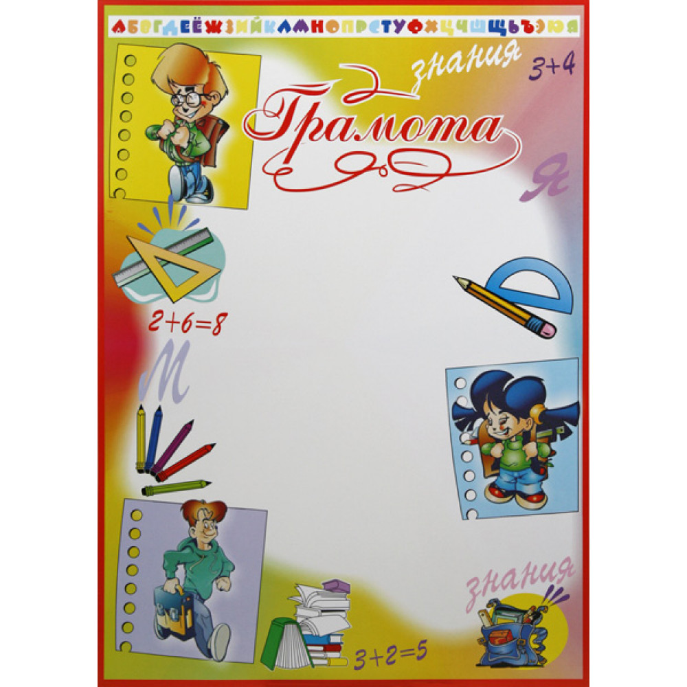 Грамота, формат А4. Бумага матовая, толщина 200 гр, полноцветная печать. ¶Фон грамоты в виде радужной палитры, по центру белый фон с неровными размытыми краями. Вверху грамоты по горизонтали изображена белая полоса с цветными буквами алфавита. В верхней части написано слово "Грамота" курсивом, цвет красный с белой обводкой. На грамоте хаотично расположены изображение карандашей, линеек, слов "знания", букв, цифр. Так же изображены мультяшные девочки и мальчики с портфелями, в квадратах цветных. Грамота имеет красную окантовку.