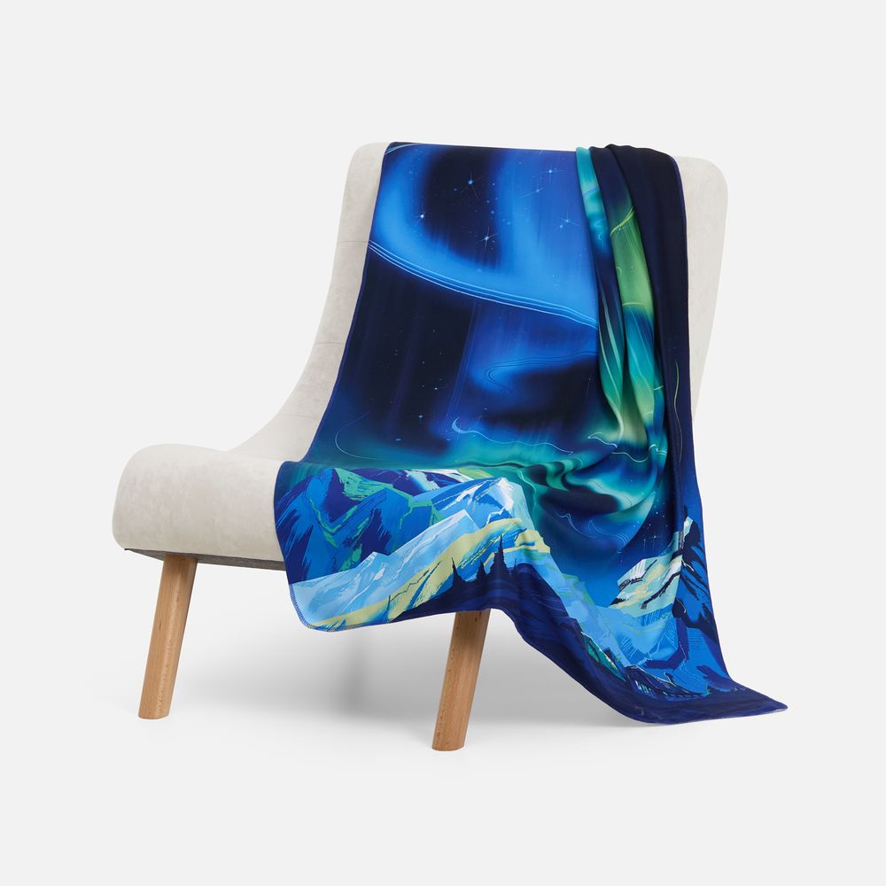 Чтобы прикоснуться к этой мечте Севера, можно начать с живописного пледа «Сияй!» — это и пожелание на будущий год, и способ стать ближе к ускользающей красоте авроры. И может, плед с таким завораживающим, словно акварельным пейзажем поможет по-настоящему почувствовать сияние — и сиять так ярко, как не сиял никто.