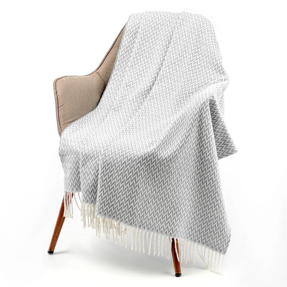 Плед Sagunt с ненавязчивым зигзагообразным узором и аккуратной бахромой подарит мгновения уюта и радости, порадует своим нежным дизайном и окутает теплом.
