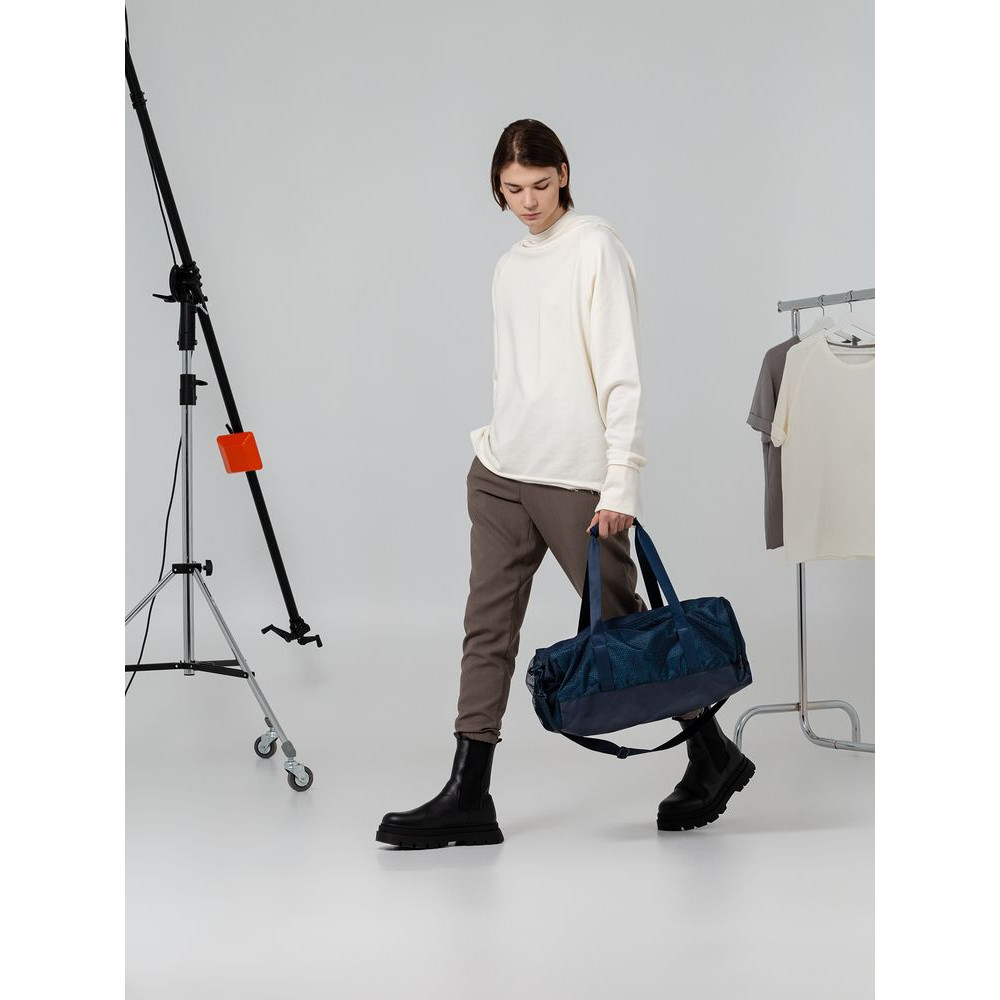 Цвет Outer Space лег в основу коллекции сумок Triangel, позволяя создать модное монохромное сочетание с изделиями Manevr темно-синего цвета. Изделия изготовлены из шелковистого полиэстера, в отделке использована лазерная перфорация паттерна.