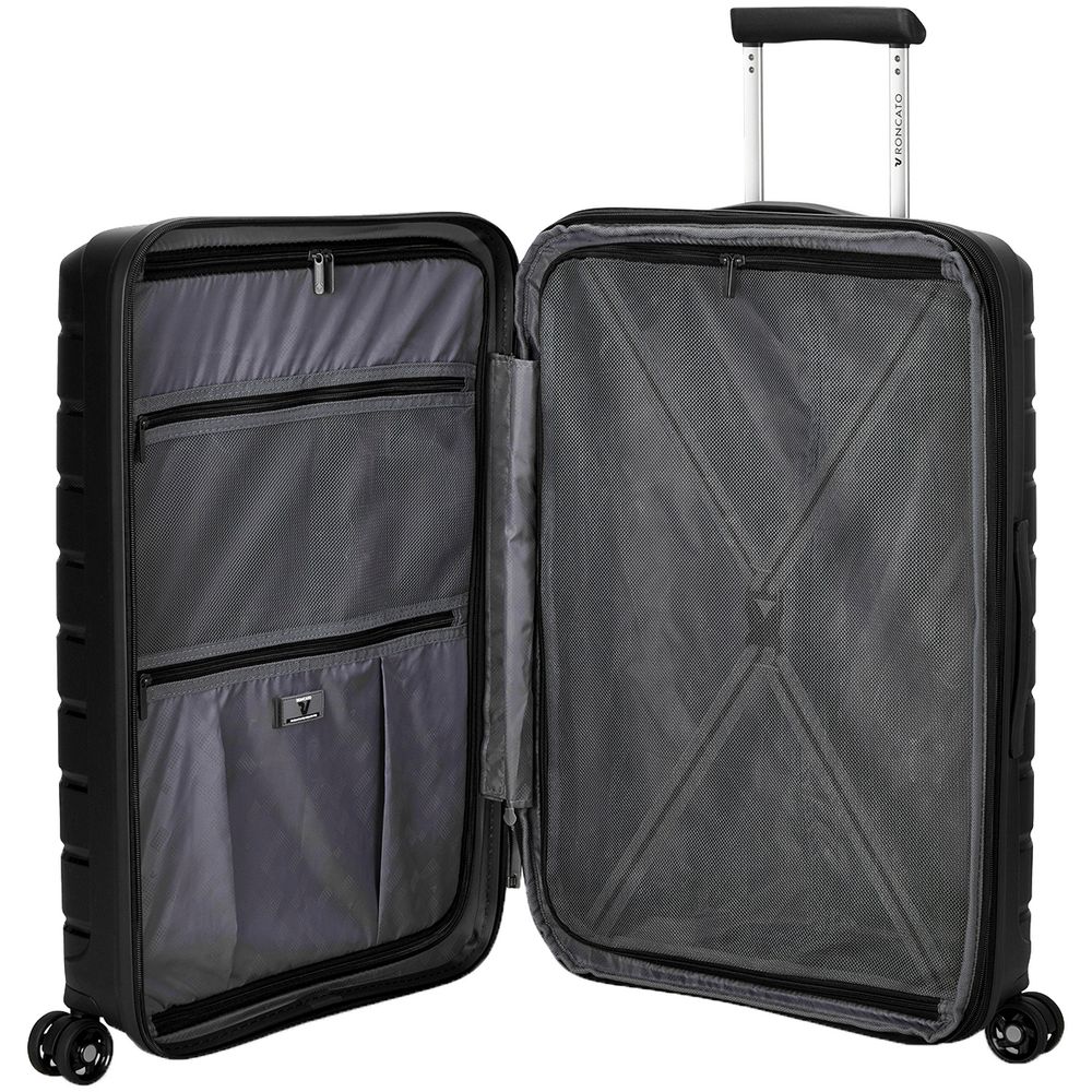 • Чемодан с 2 отделениями: одно отделение с сетчатым разделителем и прижимными ремнями, а второе оснащено перегородкой на молнии с двумя карманами
