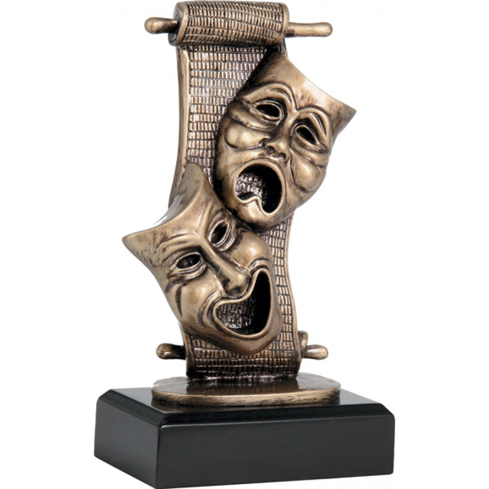 Фигурка литая "Театр". Цвет бронза. Материал: пластик. Высота 19,5 см. Изображен свиток пергаментной бумаги, расположенный вертикально, поверх него изображены две рельефные театральные маски, выступающие за края свитка. Верхняя маска олицетворяет "горе", нижняя маска олицетворяет "радость". Фигурка установлена на плоском овале, который установлен на цоколе черного цвета, в форме параллелепипеда.
