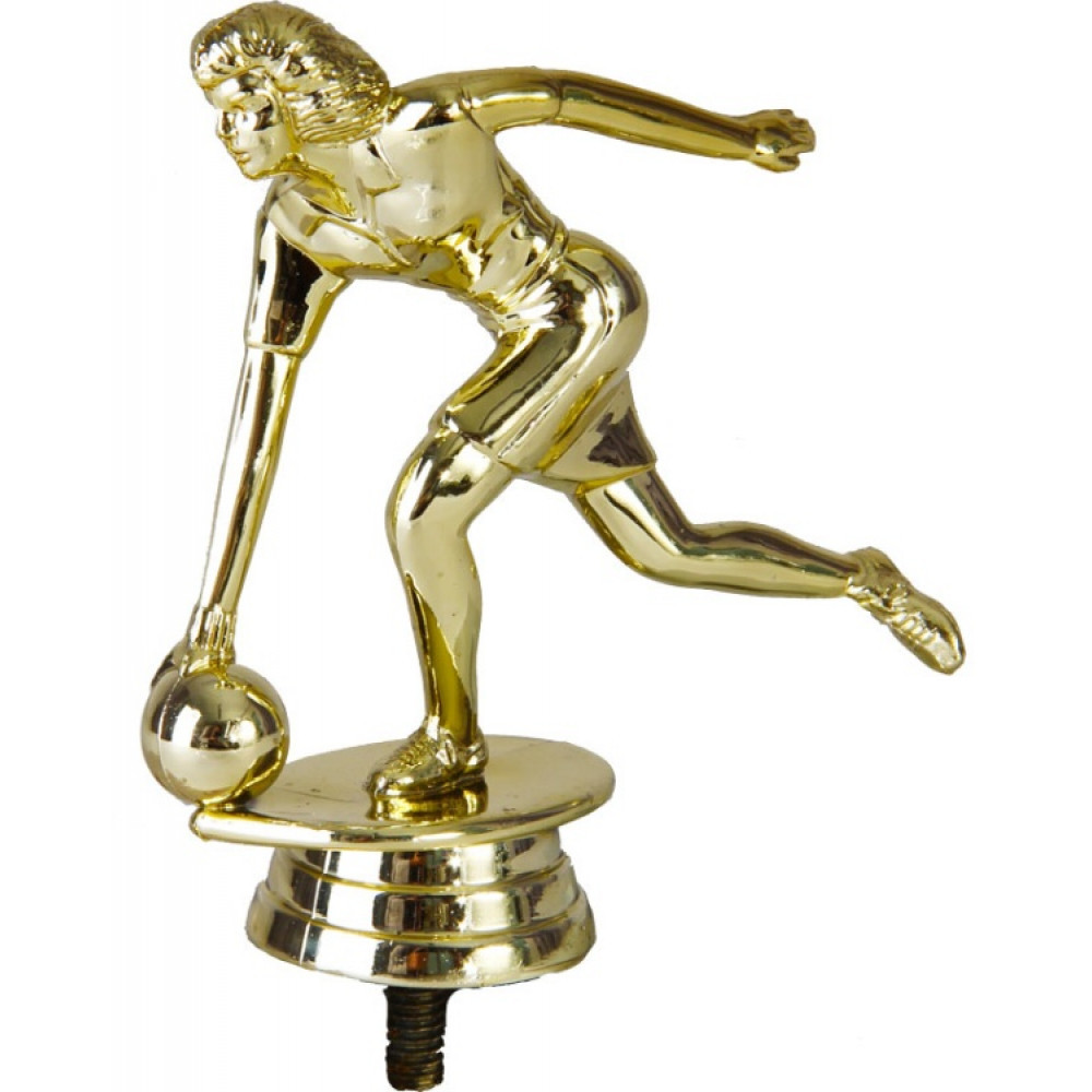 Цвет: золото, материал: пластик. Вид спорта: боулинг. Фигурка выполнена в виде женщины. Её волосы завиты в элегантные локоны. Левая нога согнута в колене, правая зависла в воздухе. Игрок нагнулся вниз, зажав мяч в левой руке, правая отставлена назад. Игрок сконцентрировано смотрит на свою цель, не отводя взгляда. Юбка немного приподнялась из-за движения. Женщина находится на тонкой закруглённой по краям пластине – имитации пола. Ниже - круглое основание, на котором имеются горизонтальные линии. Высота, см: 10.2 Вес, кг: 0.037. Фигурку возможно закрепить на цоколь, постамент или кубок.