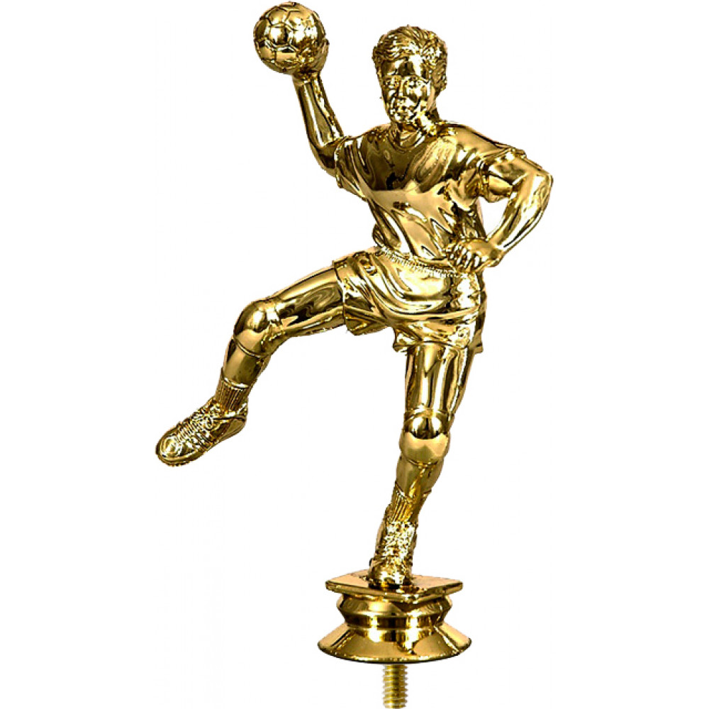Фигурка пластиковая "Гандбол". Цвет золото. Высота 14 см. Изображен спортсмен, в правой руке держит мяч и готовится совершить бросок, правая нога приподнята вверх. Фигурка установлена на стеме в виде небольшого элемента конусообразной формы. Фигурку возможно закрепить на цоколь, постамент или кубок.