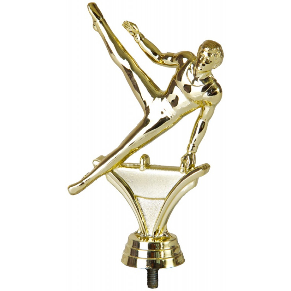 Цвет: золото, материал: пластик. Вид спорта: гимнастика. Фигурка выполнена в виде мужчины-гимнаста. Он выполняет упражнение на снаряде: гимнастическом козле. Его ноги напряжены и носки вытянуты. Ноги зависли в воздухе, правая нога находится вверху. Мужчина опирается на левую вытянутую руку, правая согнута в локте. Ниже - круглое основание, на котором имеются горизонтальные линии. Высота, см: 14 Вес, кг: 0.046. Фигурку возможно закрепить на цоколь, постамент или кубок.