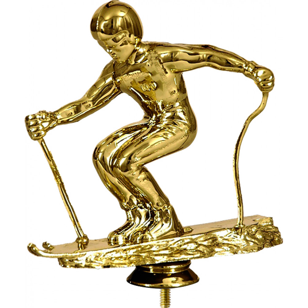 Фигурка пластиковая "Лыжник", высота 13 см. Изображен спортсмен, спускающийся с горы на лыжах, в руках палки. На голове одет шлем. Фигура установлена на небольшой подставке круглой формы. Фигурку возможно закрепить на цоколь, постамент или кубок.