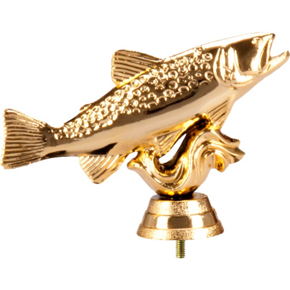 Фигурка пластиковая "Рыба". Цвет золото. Высота 6,5 см. Изображена рыба, с чешуей, верхними и нижними плавниками, хвостом, у рыбы открыт рот. Фигура рыбы расположена горизонтально, нижние плавники расположены на волне.¶Фигурка установлена на стеме в виде небольшого элемента конусообразной формы. Фигурку возможно закрепить на цоколь, постамент или кубок.