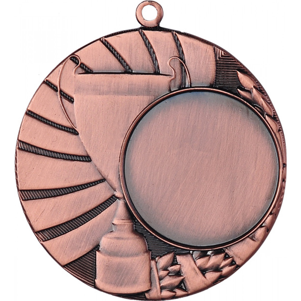Медаль круглая металлическая. Диаметр 45 мм, толщина 2,5 мм.¶Цвет медали, имитирующий золото/серебро/бронзу.¶Сверху расположено круглое ушко для крепления ленты. ¶По центру аверса расположено место под вкладку, смещенное в правую сторону, имеет тонкий кант, диаметр 25 мм.¶По центру аверса расположен выпуклый кубок, чаша глубокая, на чаше ручки, выступающие за края чаши. Место под вкладку частично закрывает кубок.¶От кубка отходят широкие выпуклые лучи в количестве 10 штук. С правой стороны расположена лавровая ветвь, частично закрываемая местом под вкладку. Фон медали в виде тонких выпуклых полос.¶На медали нет никаких других изображений, нет рисунков, относящихся к конкретному виду спорта.
