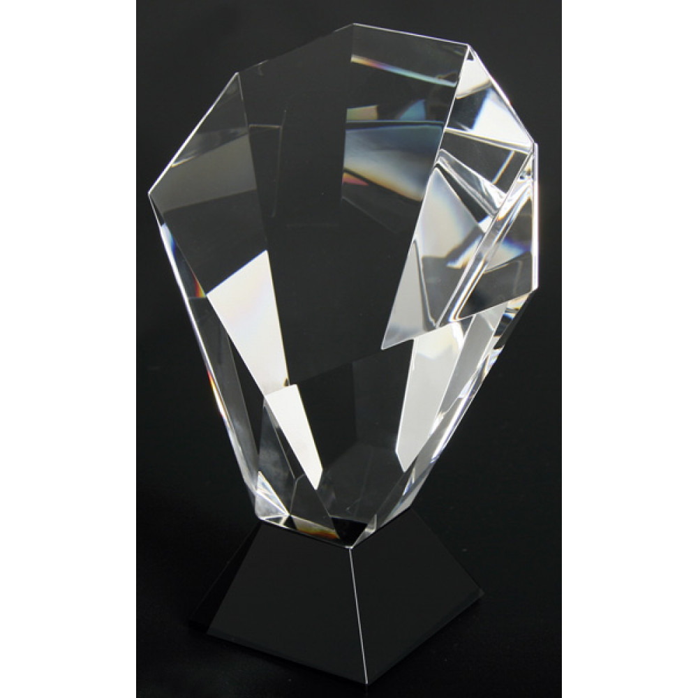 Награда хрустальная, прозрачная. Представляет собой фигуру в форме неравностороннего семиугольника, суженного у основания и расширяющегося на вершине. Имеет срез в верхней части под углом 45 градусов. Фигура установлена на цоколе в форме пирамиды, цвет цоколя черный, материал пластик.