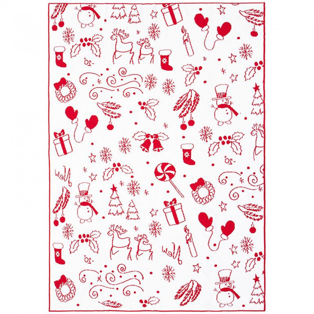 Плед с вывязанным логотипом и индивидуальным рисунком в фирменной цветовой гамме.