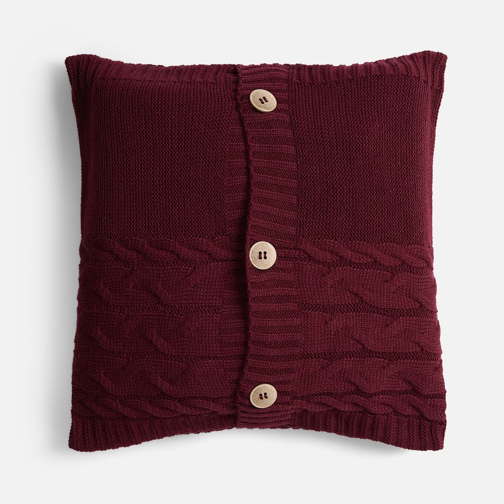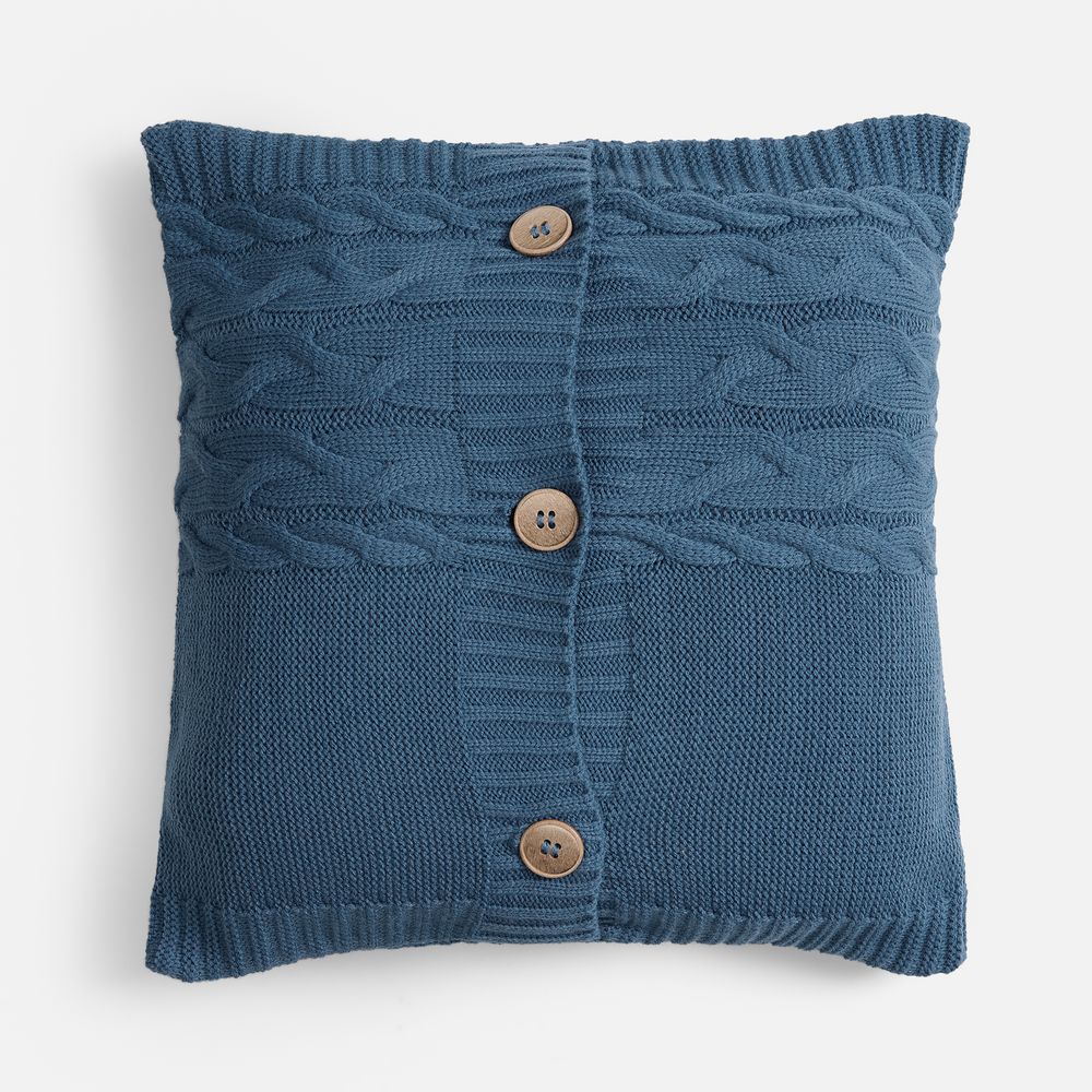 Вязаный чехол надевается на подушку из спанбонда, наполнитель — синтепон. Чехол крепится на три пуговицы.