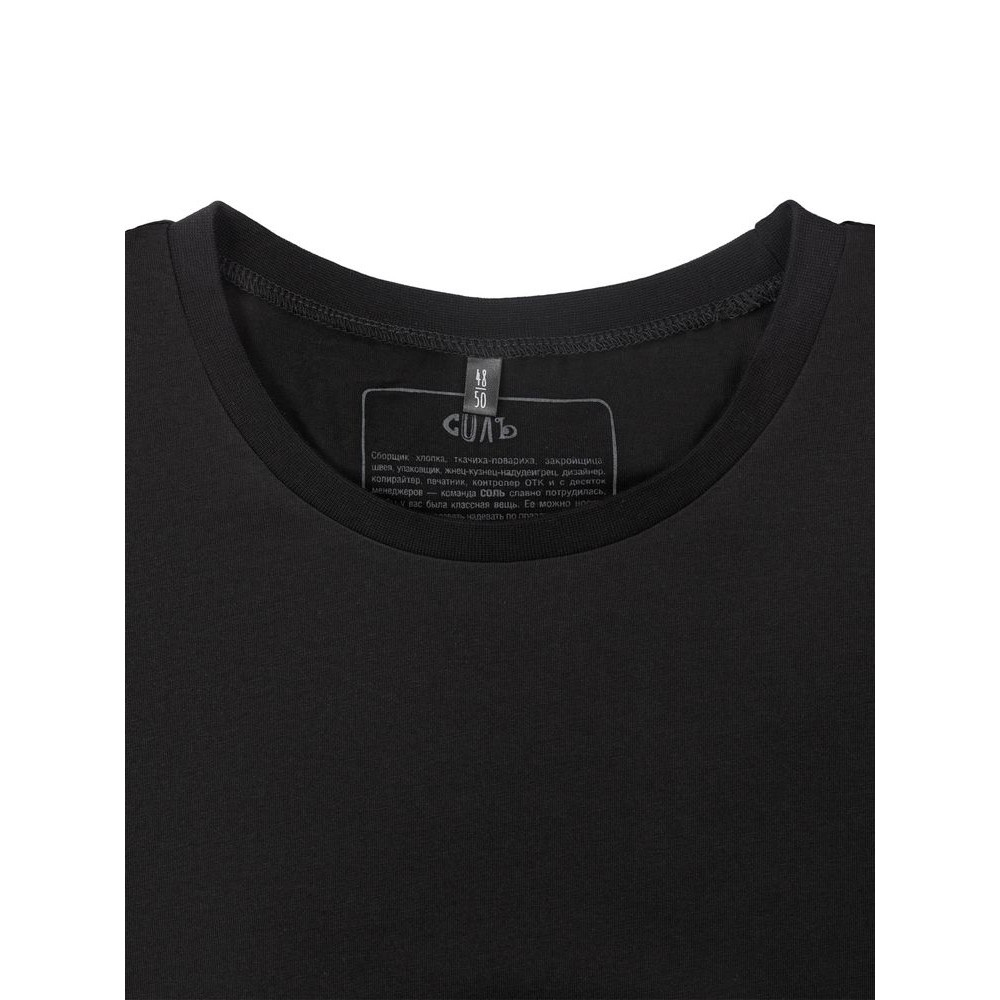 Принт с информацией о бренде и инструкцией по уходу за изделием на изнаночной стороне футболки.