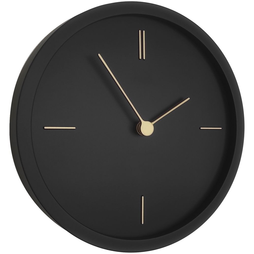 На круглом черном корпусе настенных часов Thelma выигрышно выделяются контрастные золотистые стрелки и тонкие линии часовых меток, создавая строгий и элегантный дизайн.