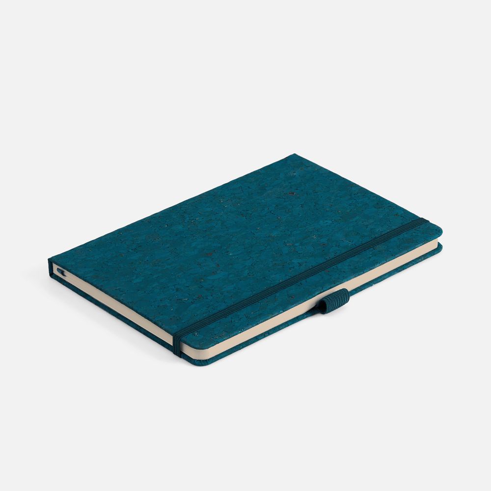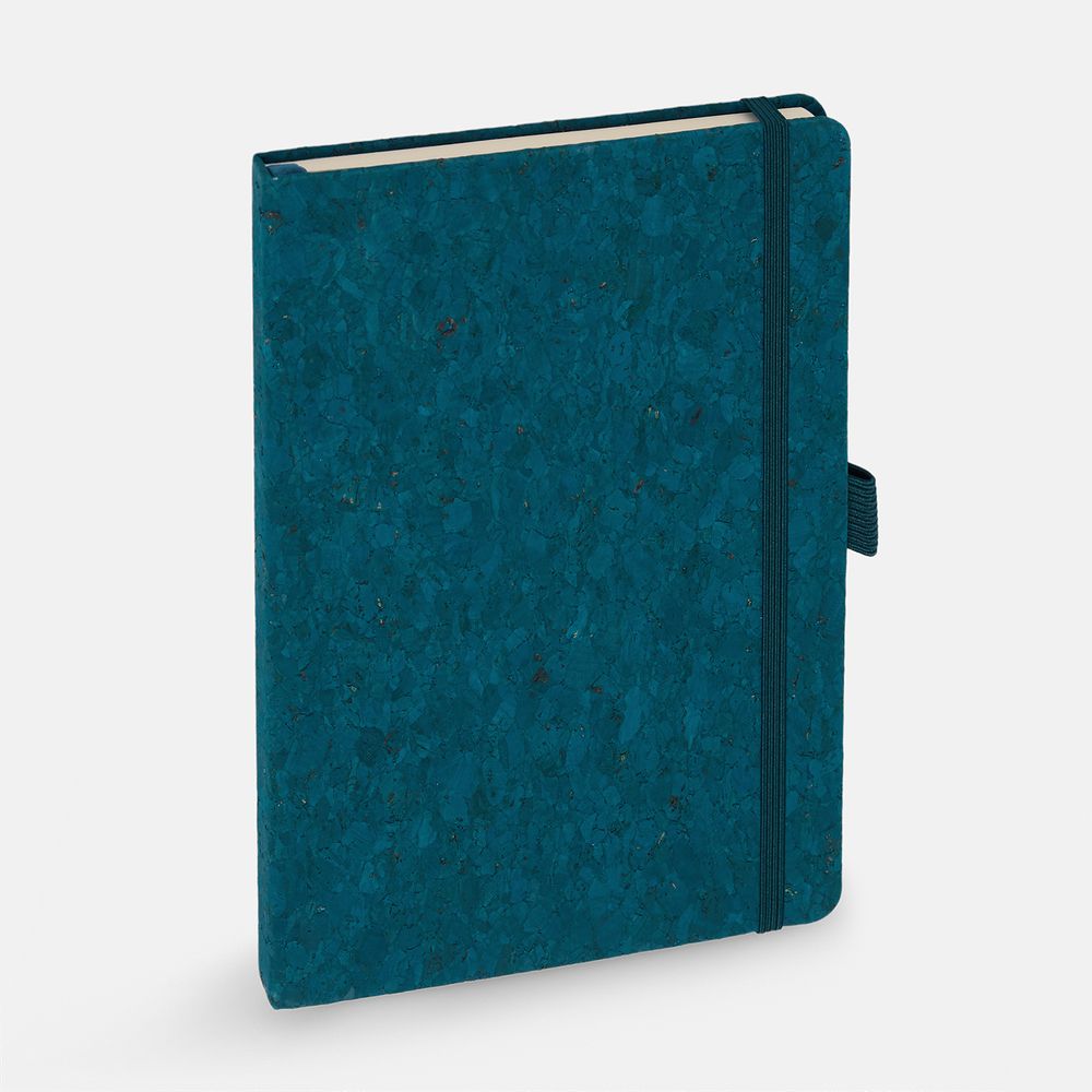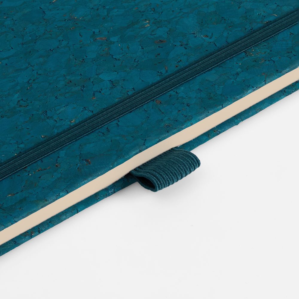 Блокнот с твердой обложкой из натуральной окрашенной пробки, дополнен петлей-резинкой для ручки, ляссе и резинкой в цвет обложки.