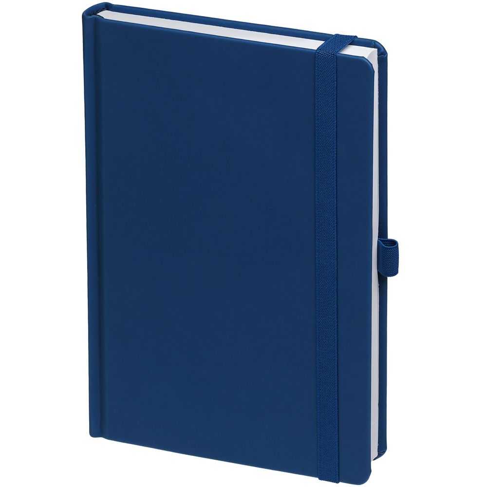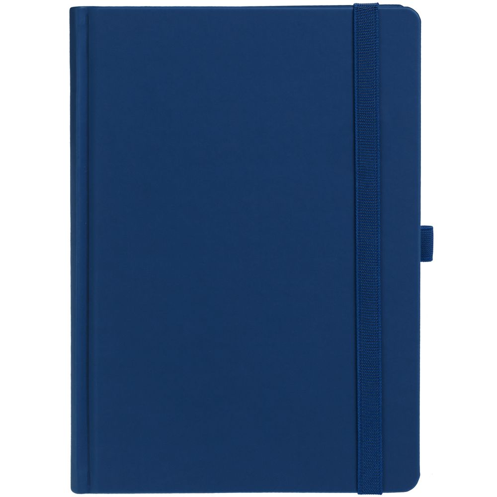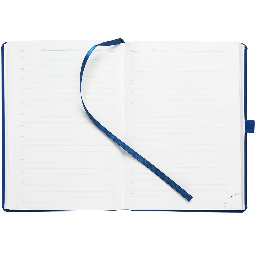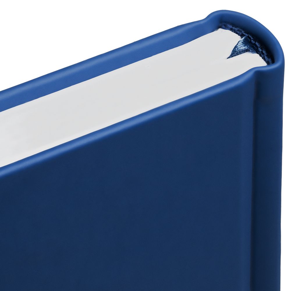 Ежедневник с твердой обложкой без поролона, выполнен из материала Soft Touch Ultra, синий НН, дополнен резинкой шириной 1 см, петлей-резинкой для ручки, капталом и ляссе синего цвета.